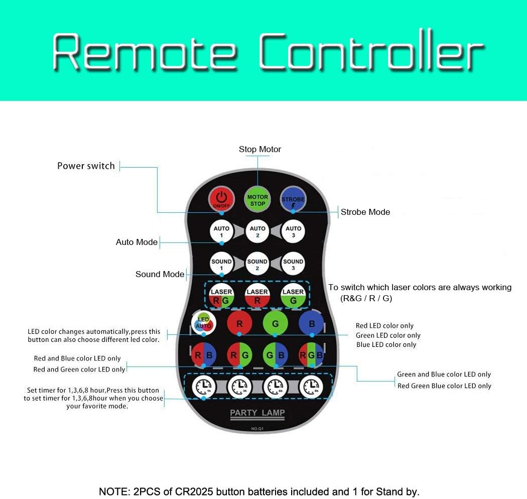 - 【Remote Control】Easily control the laser lights for party with the included remote. Adjust ON/OFF, switch between modes (Auto, Sound Activated, Strobe), or select laser patterns and background light colors to fit the vibe