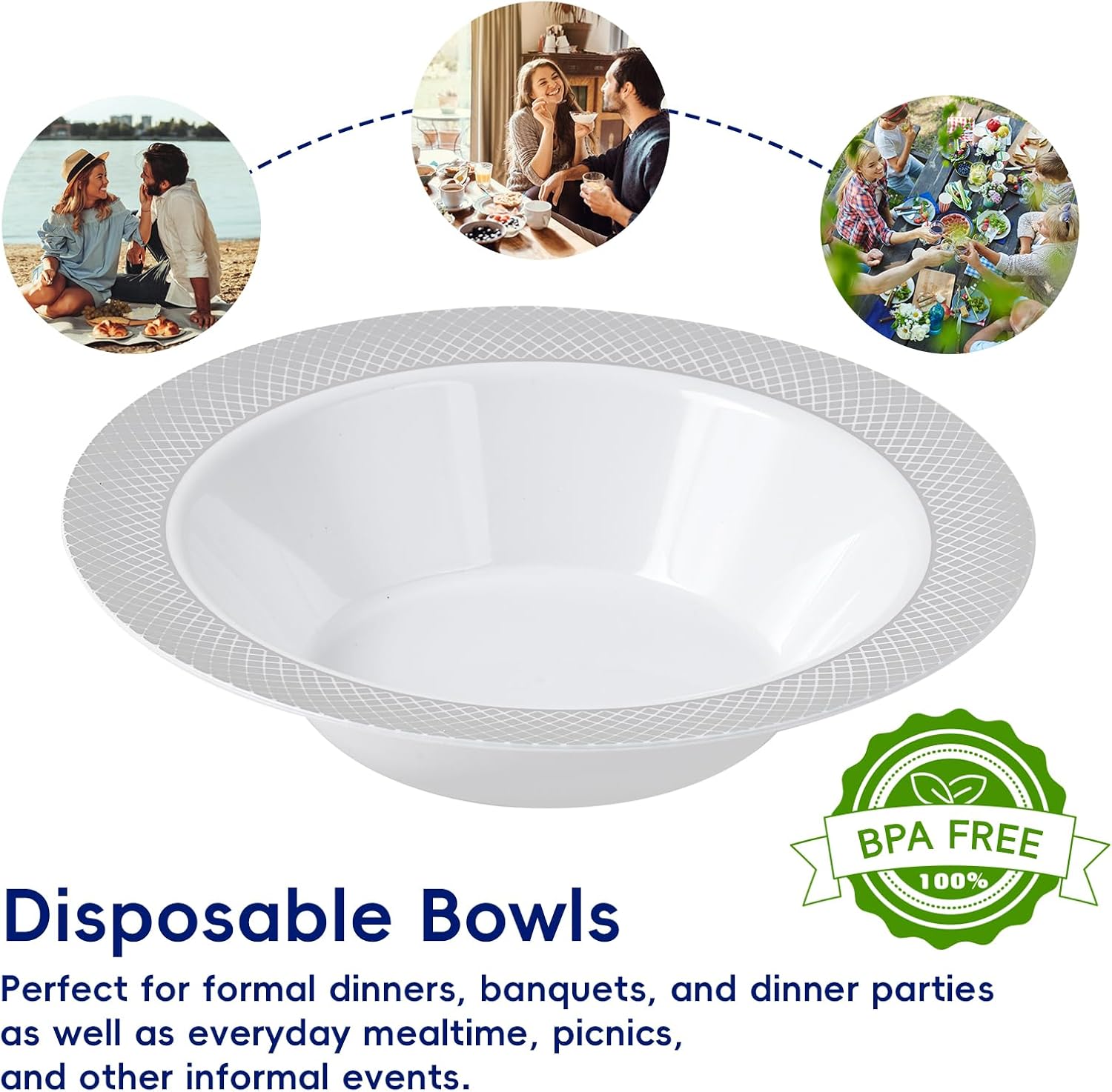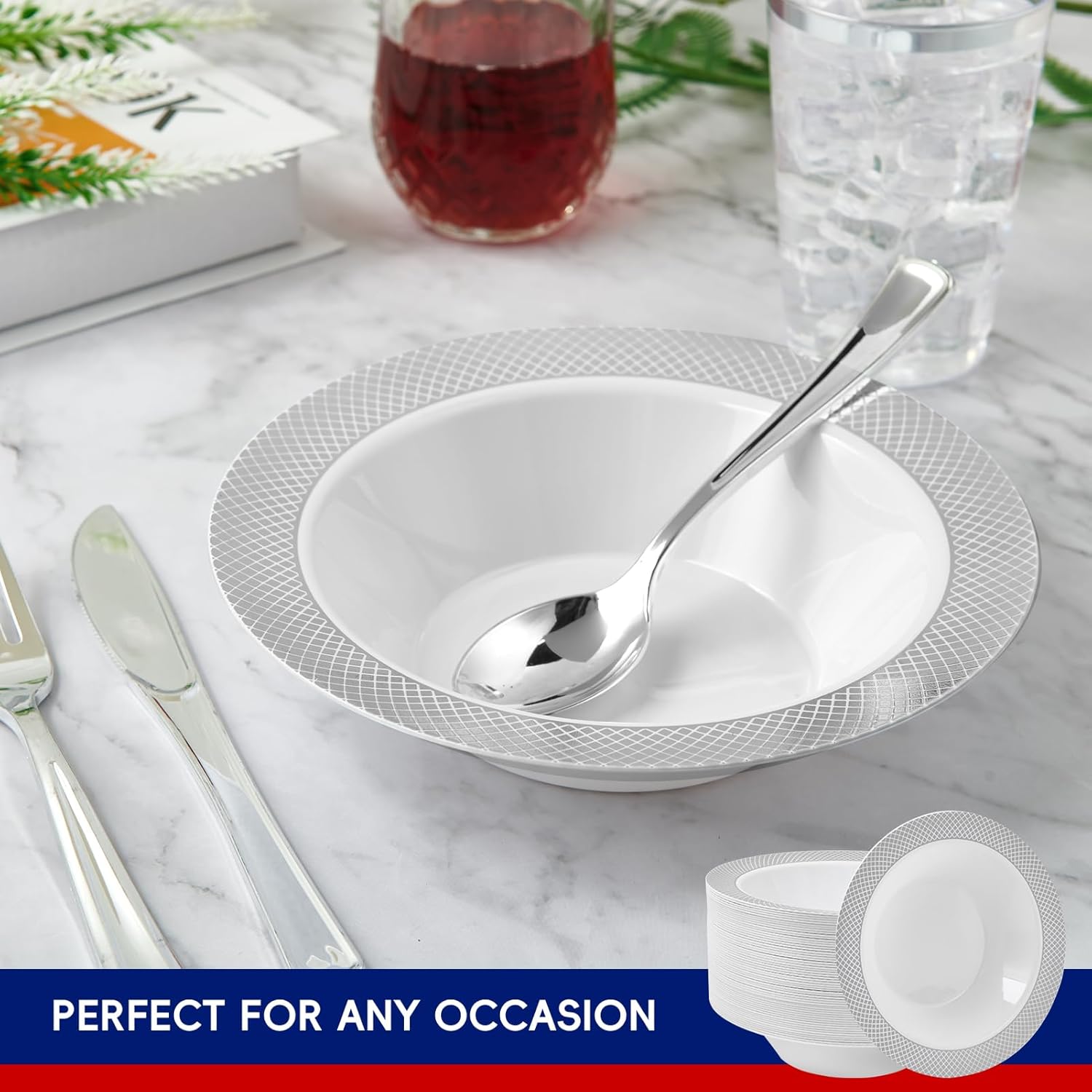 - Elegant design: The charming sliver edge design and pure white bowl body add elegance and beauty to your luxurious party decor. Each plastic bowl has a very wide edge, which can be easily picked up without burning your hand and preventing the soup from splashing out