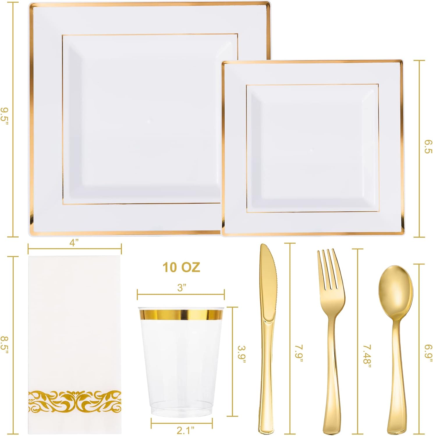 - GREAT VALUE: Our disposable dinnerware set contains 50pcs plastic dinner plates 9.5inch, disposable dessert plates 6.5inch, gold plastic cups, pcs forks, knives, spoons and napkin. Perfect for medium-sized parties such as weddings, birthdays