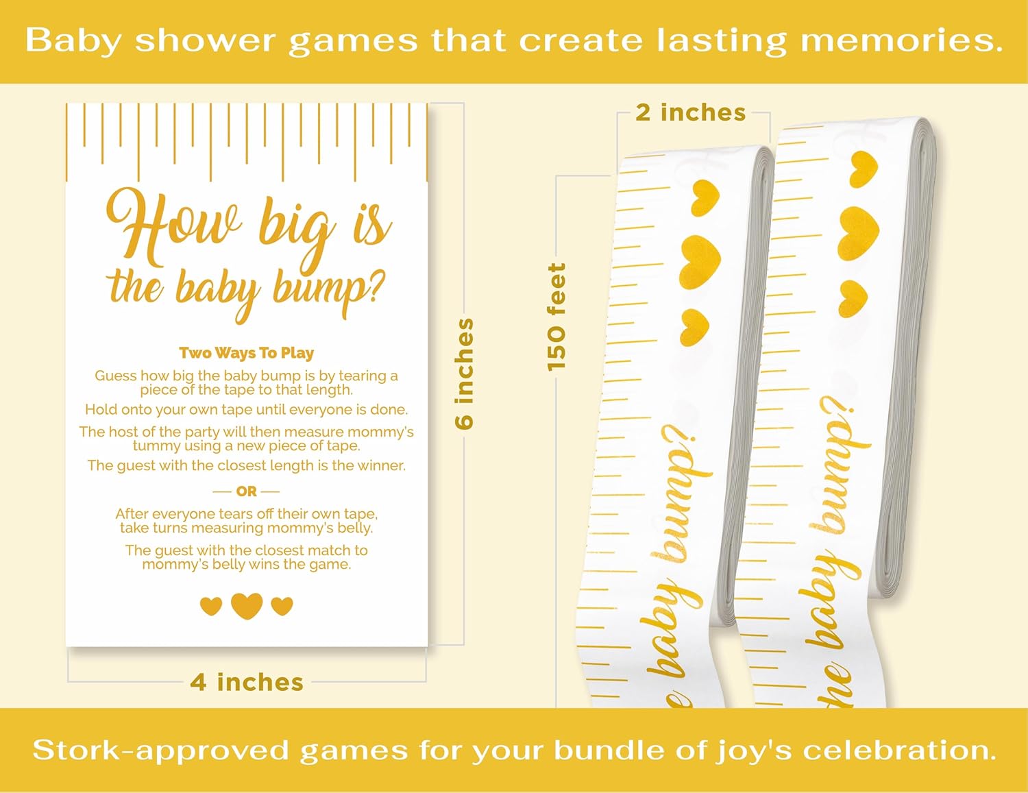 - BABY SHOWER GAME EXTRAVAGANZA Includes 2 Rolls of Gold Tummy Measure Tapes; In a perfect size of 2 inches x 150 feet; Professionally printed on a premium paper for its sturdiness yet easy to tear; No need for scissors