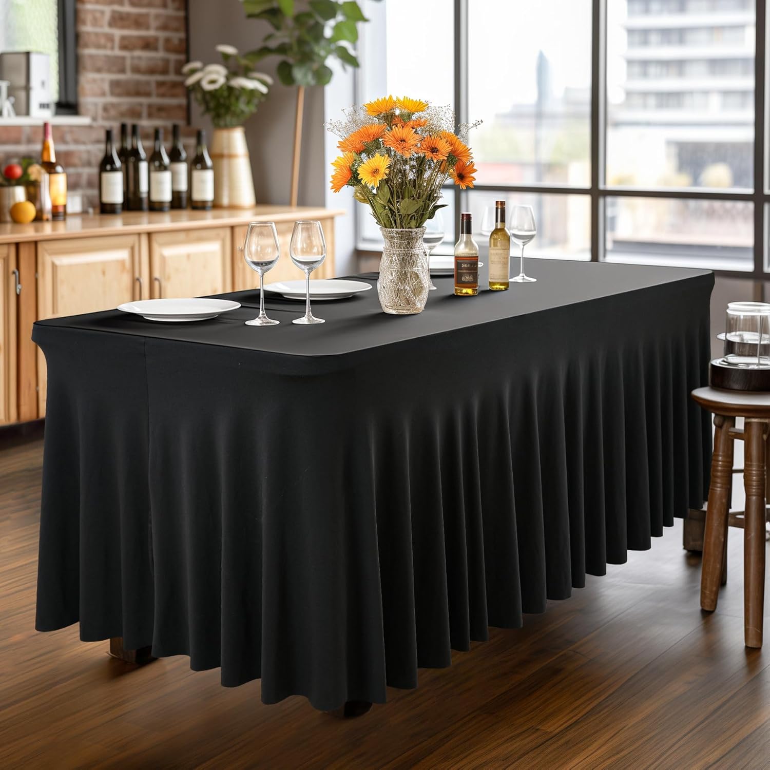 - 🎀 Elegant Design: The black table cloth rectangle features a floor-length design which can easily conceals unattractive table legs, extra supplies, power cords, or other items stored underneath. This stretchy table cloth with skirt shows pleats to make your table look more elegant.