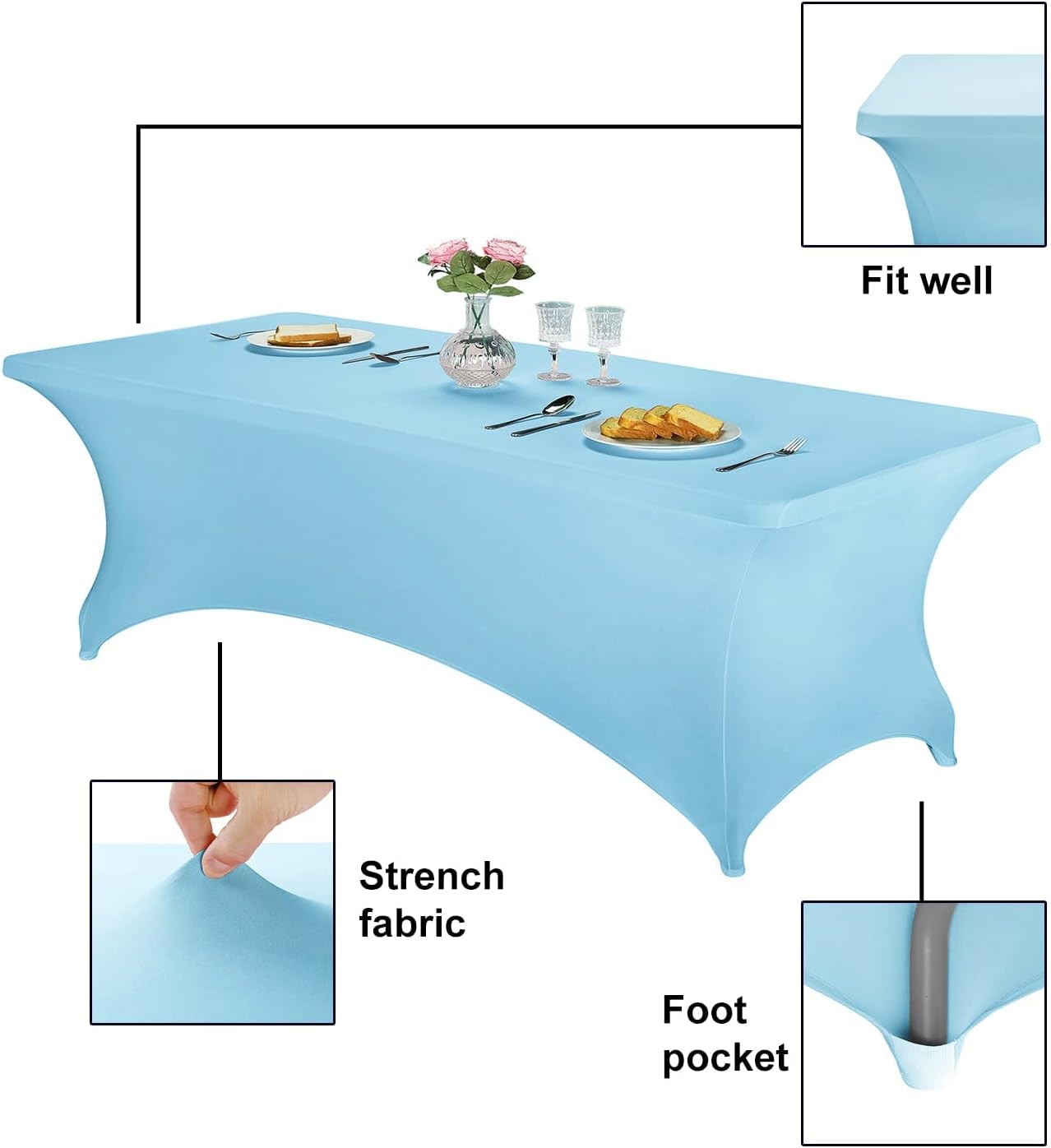 - Stretchy Fabric & Foot Pocket Design makes the table cover fit well with the table and stay in place. It's easy to install and absolutely a time-saving choice for decorating parties.