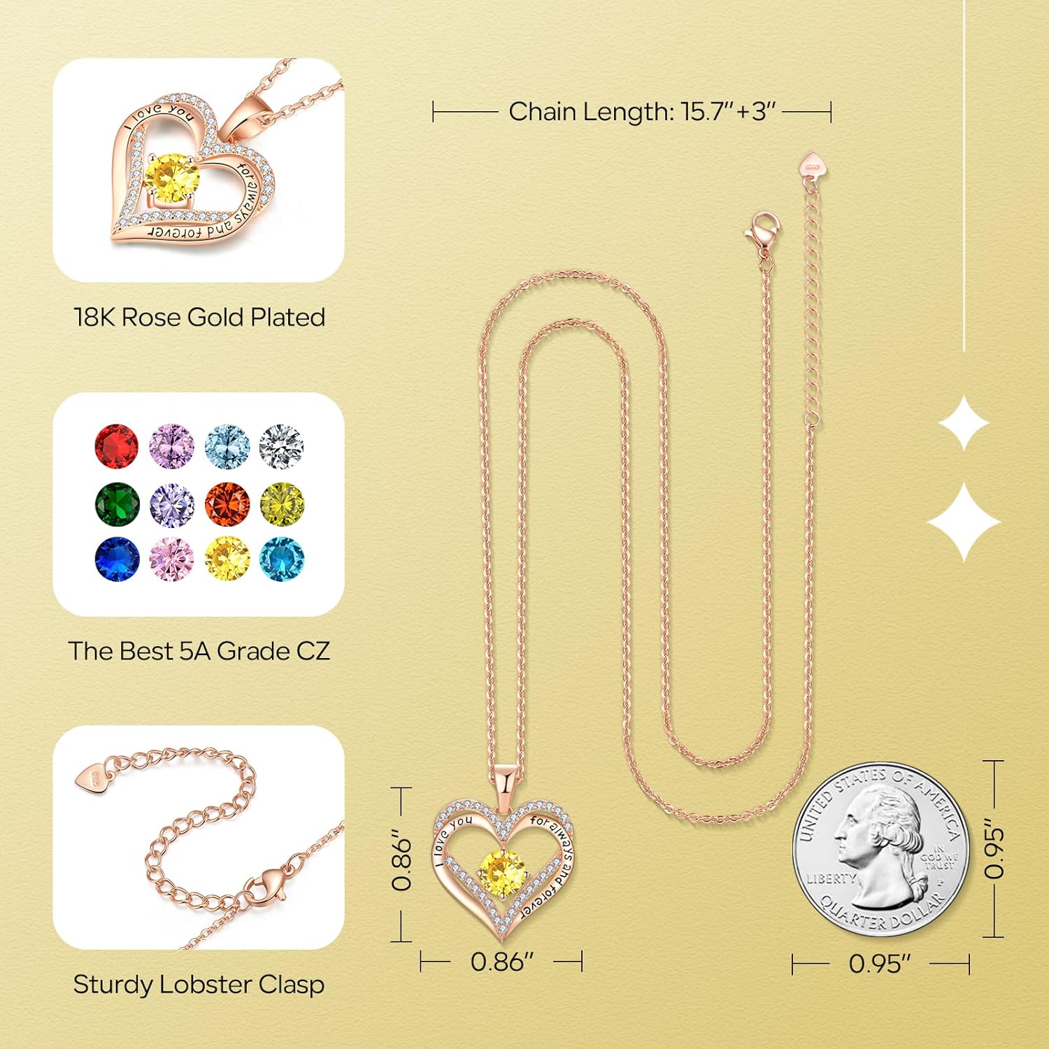 - 12 Colors of Birthstones for 12 Months: There are 12 colors of birthstones representing 12 months.The rose gold birthstone necklace makes a elegant birthday Jewelry for women. Garnet for Jan, Amethyst for Feb, Aquamarine for March, Diamond for Apr, Emerald for May, Alexandrite for June, Ruby for July, Peridot for Aug, Sapphire for Sept, Tourmaline for Oct, Citrine for Nov, Turquoise for Dec