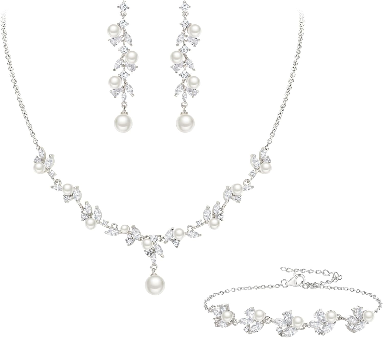 - ❤Material❤ Pearl Bridal Necklace Earrings Bracelet Set Features Simulated Pearls with Brilliant Marques Cubic Zirconia, Lead-free and Nickel-free, Hypoallergenic.