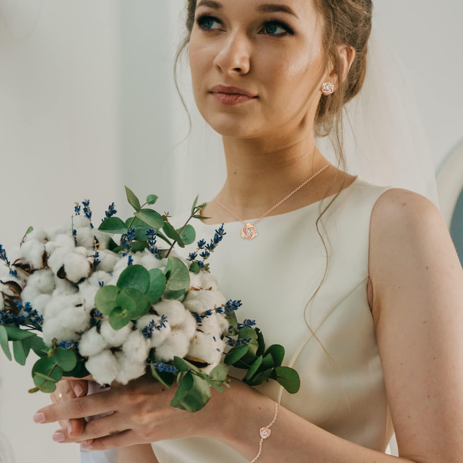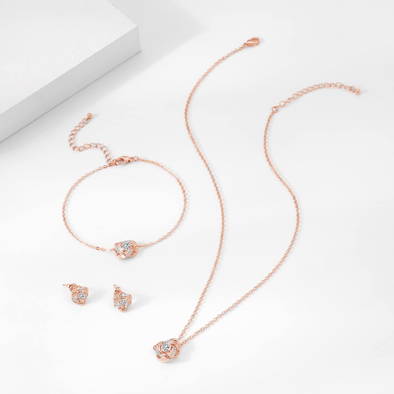 - 【Bridesmaid Jewelry Set】 Perfect Bridesmaid Jewelry Set,Knot Necklace+Link Bracelet+Knot Earrings. Elegant and streamlined design,Inlaid with rhinestones and crystal , Shiny and sparkling. The classic and elegant always keep pace With Fashion,Which will make a timeless accessory to bridesmaid jewelry collection, Wearing this bridesmaid jewelry set, Give you charming look and win more compliments