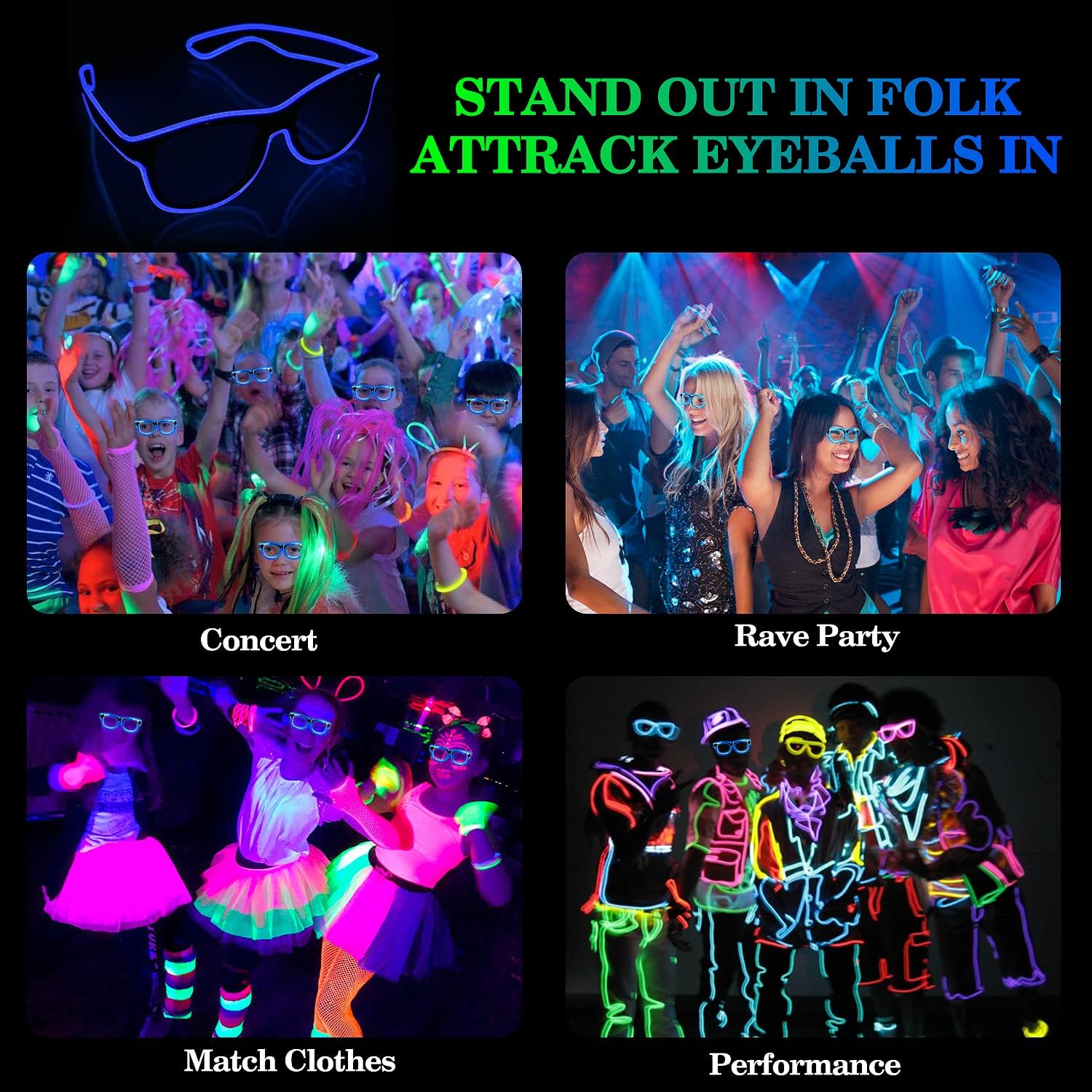 - Stand Out in Folks: Turn heads and grab tons of attention with our light up glasses! Perfect for rave parties, EDM events, Halloween, Carnival, or Christmas. Be the star of the night with these glow in the dark glasses, making every event unforgettable