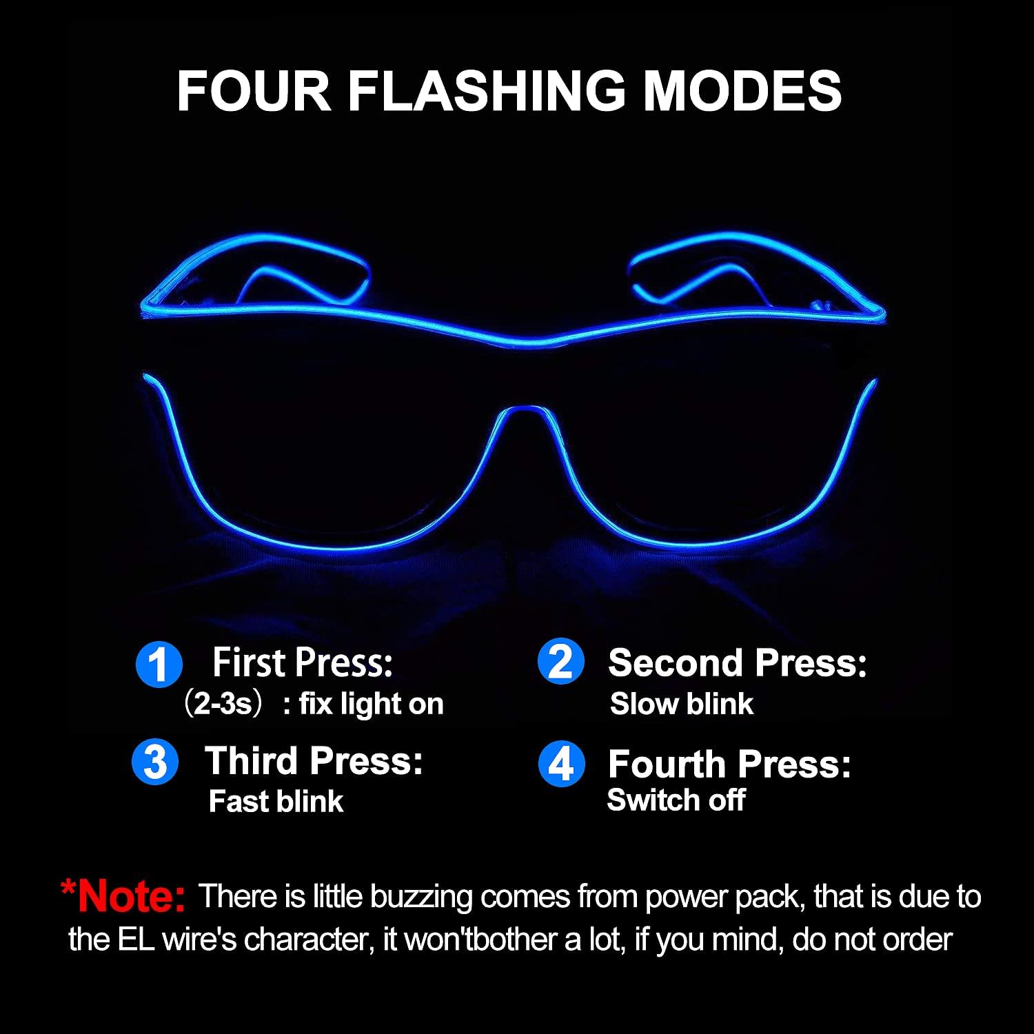 - Glow Your Way: Change your glow to match your mood with just one button! Our glow glasses feature four light modes: fixed, slow blink, fast blink, and off. These neon glasses for glow party are perfect for switching up your style and keeping the party exciting