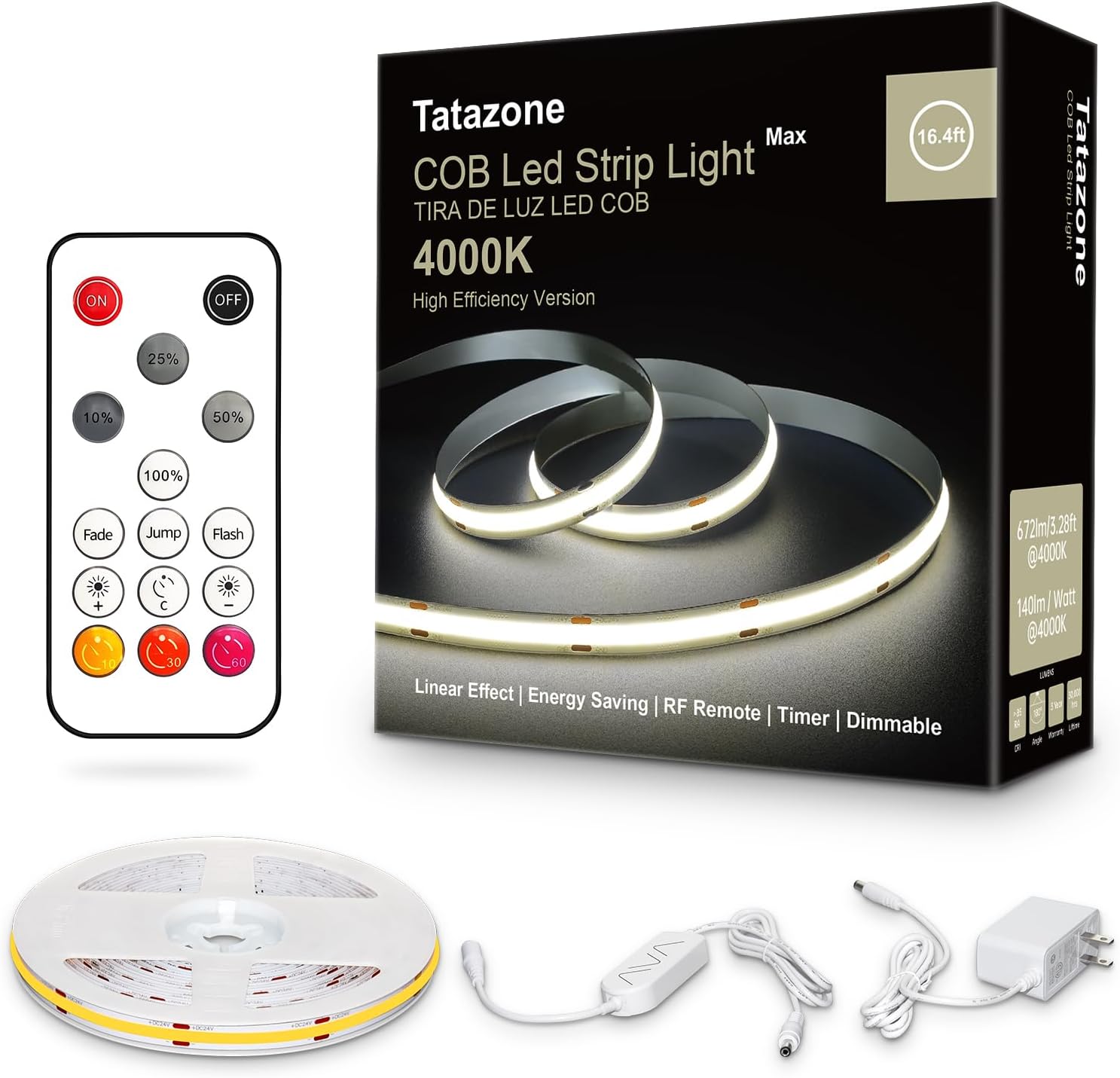 White COB Led Strip Lights Max with RF Remote, 16.4ft 4000K Dimmable Ultra Bright Neutral White COB Light Strip, Indoor COB Led Lights for Mirror, Ceiling, Kitchen, Room, Cabinet, Closet