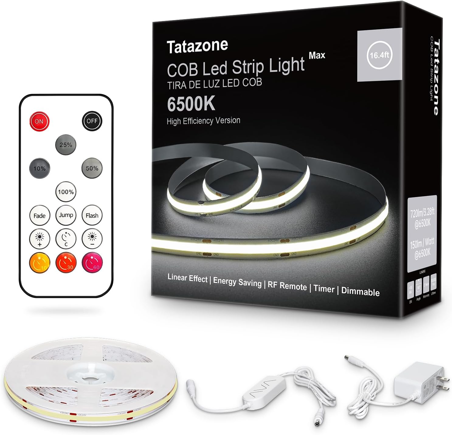 White COB Led Strip Light Max with RF Remote, 16.4ft 6500K Dimmable Ultra Bright Daylight White COB Light Strip, Indoor COB Led Lights for Mirror, Ceiling, Kitchen, Room, Cabinet, Closet