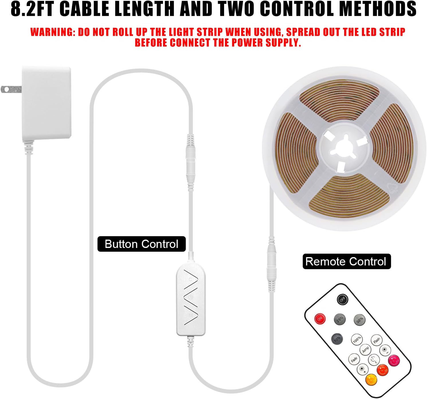 - Easy to DIY: Flexible and cuttable COB light strip with strong adhesive tape, and 8.2ft wire lead from power supply to light strip, makes easy to bend angle to install and decorate (Do not stick on frosted glass, dusty wall, rough plastic surface, wool fabrics)