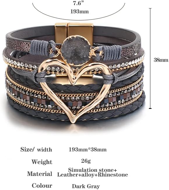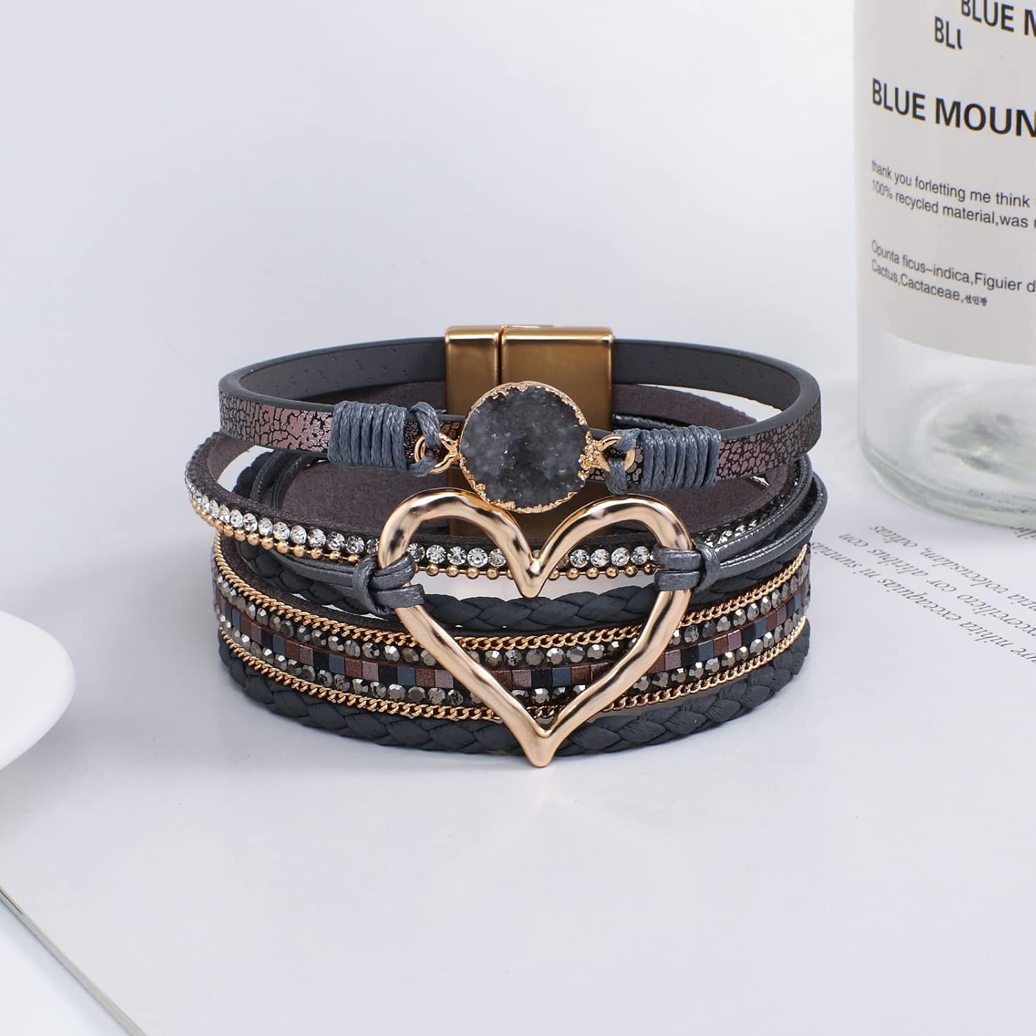 - This boho leather bracelet features multiple strands of leather combination in different styles, decorated with rhinestone and heart-shaped alloy.