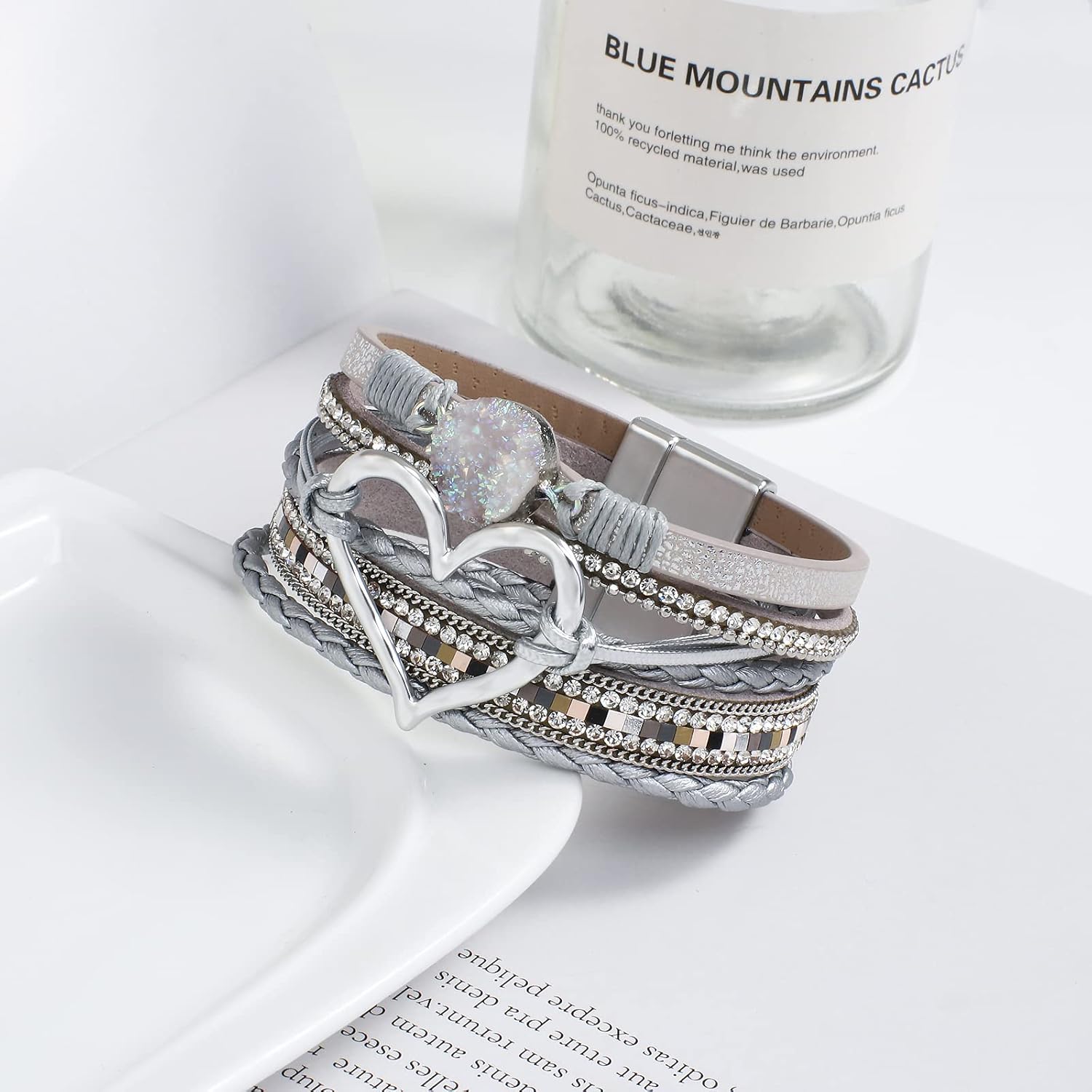 Leather Wrap Bracelet for Women Beaded Cuff Bracelet with Heart-shape Decor Bohemian Crystal Bracelet Jewelry with Clasp Bangle Bracelet for Women Girls Birthday Holiday Gift