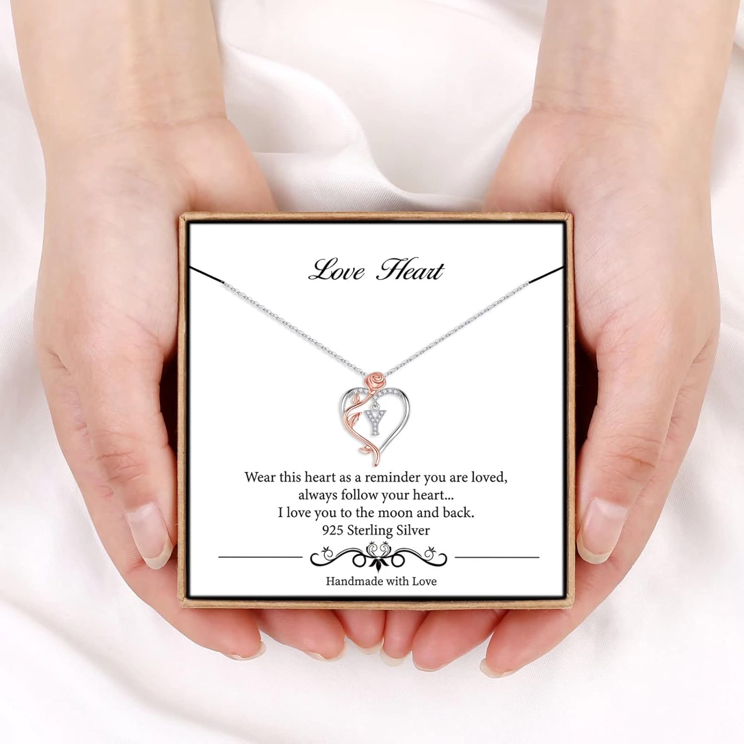 Iefil Christmas Gifts for Women Wife - 925 Sterling Silver Rose Heart Initial Necklace, Anniversary Birthday Gifts for Women, Jewelry Gift for Her Wife Girlfriend Mom Daughter