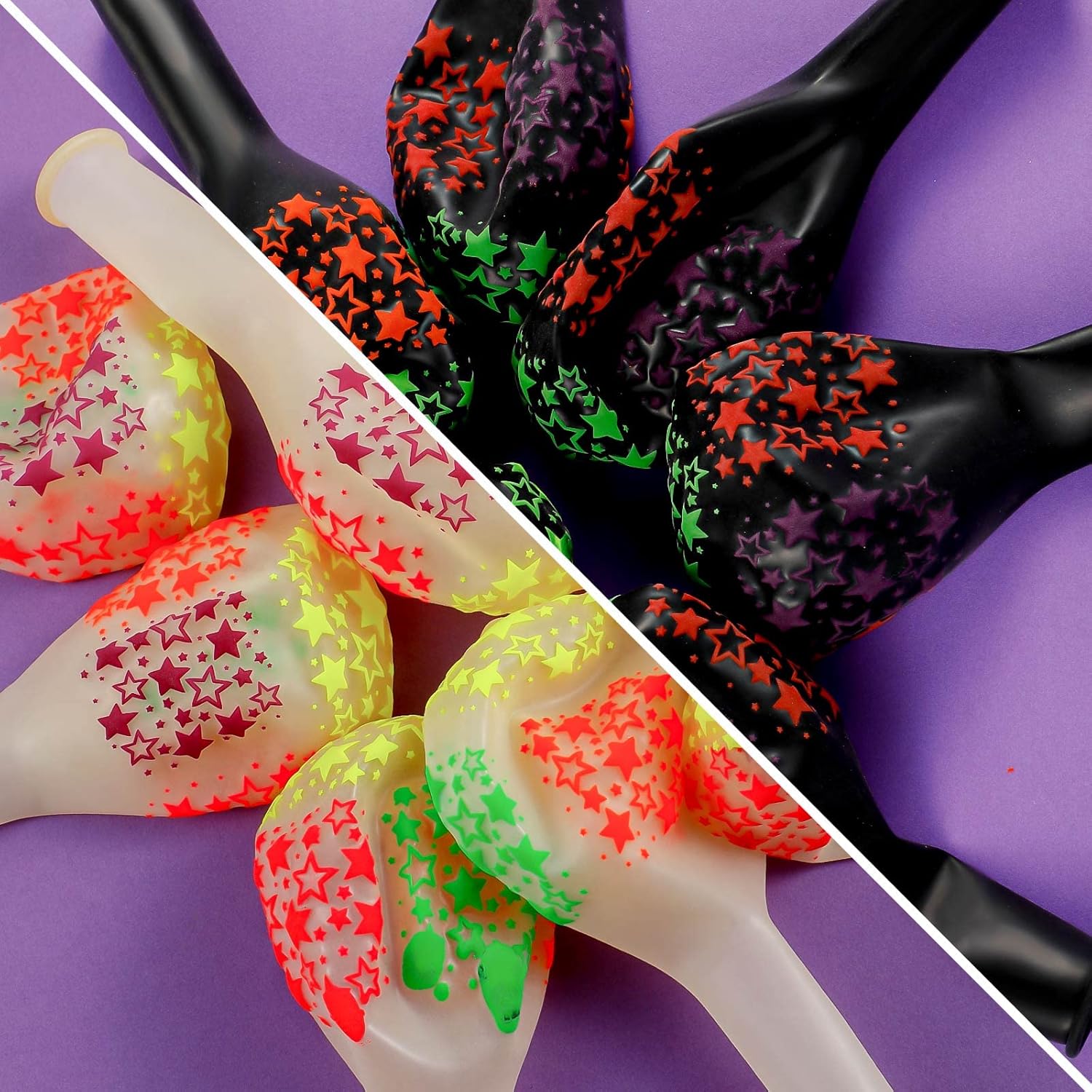 - Neon fluorescent balloons: these neon balloons are bright in the dark, made of quality latex materials, which are serviceable and safe to use, and can be filled with helium; 12 inches when fully inflated, can be combined into various Balloon graphics of animals and plants, both adults and children will love it. Each balloon has colorful patterns, which will shine on any occasion, adding more fun to your party