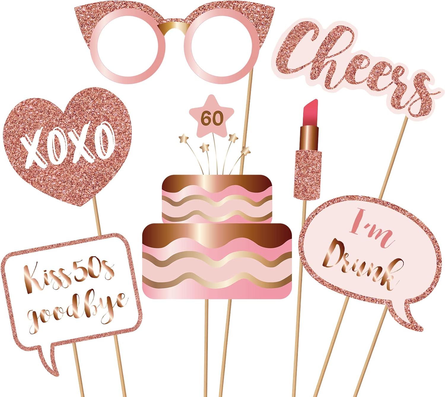 60th Birthday Party Photo Booth Props and Signs, Rose Gold 60 Birthday Party Selfie Props Kit with Sticks for Girls Women, Sixty 60th Happy Birthday Party Decorations Supplies Favors