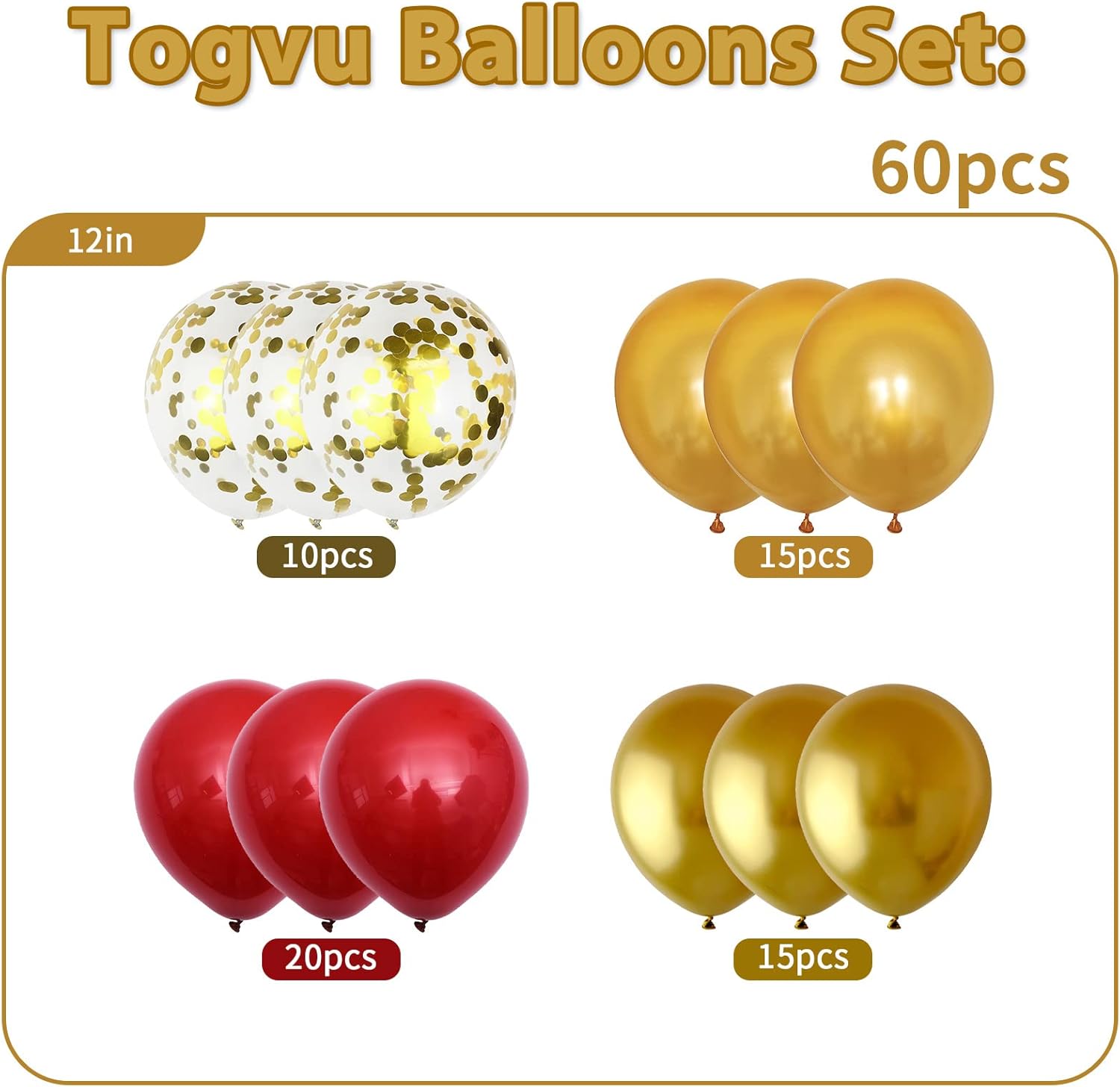 - 🎈【Red Gold Balloons Set】You will get 4 different colors of 12 inch balloons, metallic gold 15 pcs, retro red 20 pcs, gold confetti 10pcs, pearl gold 15 pcs, total 60 pieces, with 1pc red balloon ribbon and 1pc gold balloon ribbon.