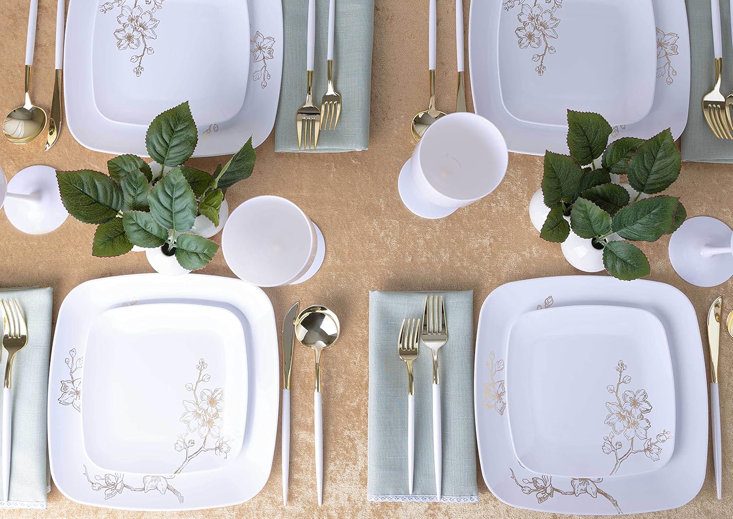 - Plasticpro Square 32 Piece Combo Plates Set includes 16 x 7'' inch Salad Plates & 16 x 10'' inch Dinner Plates White Plastic Gold Buds Design Party Plates, Premium heavyweight Elegant, Disposable, Tableware, Dishes,