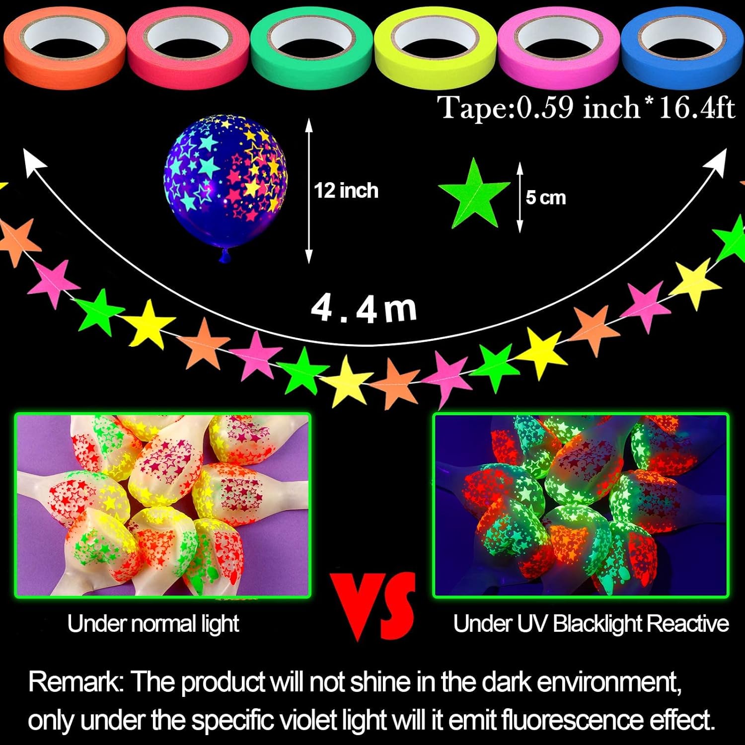 - What you can get: the glow in the dark party supplies package comes with 25 pieces of 12 inch neon latex balloons, a 173 inch neon light paper wreath, and 6 pieces of 16.4 ft ultraviolet black photosensitive tapes, which meet the needs of many festivals or daily parties decoration and are sure to be loved at any neon LED theme or luminous parties