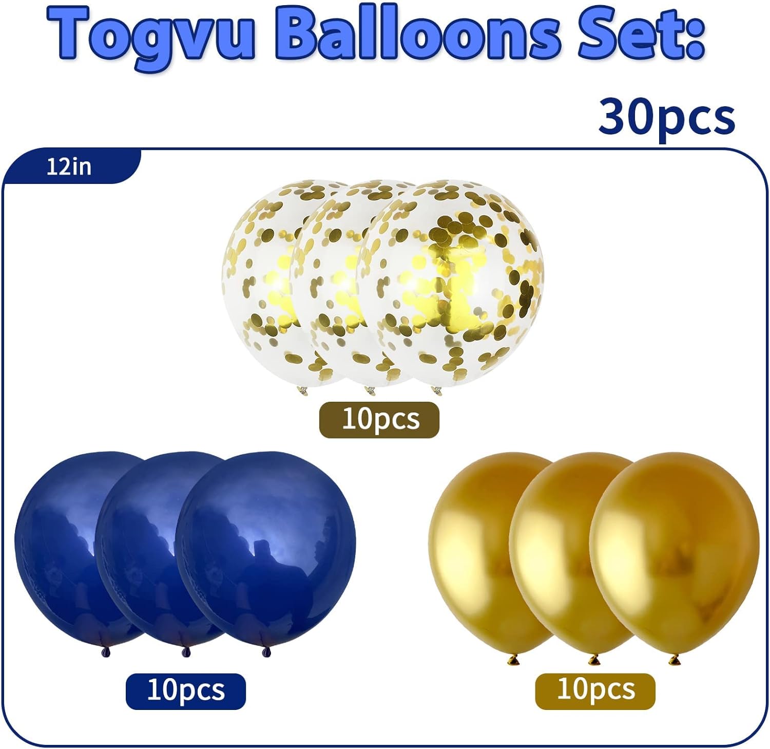 - 🎈【Navy Blue Gold Balloons Set】You will get 3 different colors of 12 inch balloons, metallic gold 10 pcs, transparent navy blue 10 pcs, gold confetti 10pcs, total 30 pieces, with 1pc blue balloon ribbon.