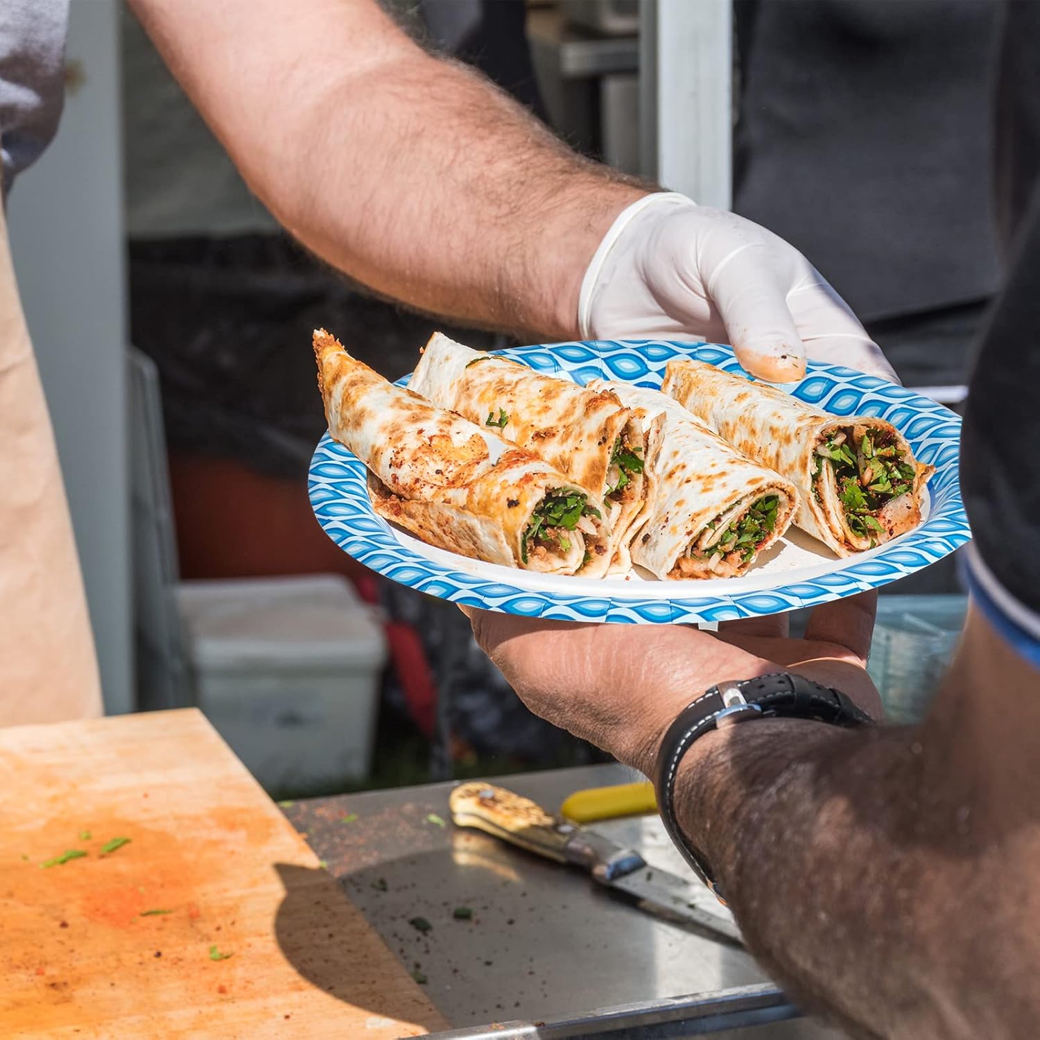 - 10 Inch Paper Plates: These paper plates bulk are durable and cut resistant. With Bule print on the edges. And the soak proof layer on the surface, keeping greasy foods from soaking through