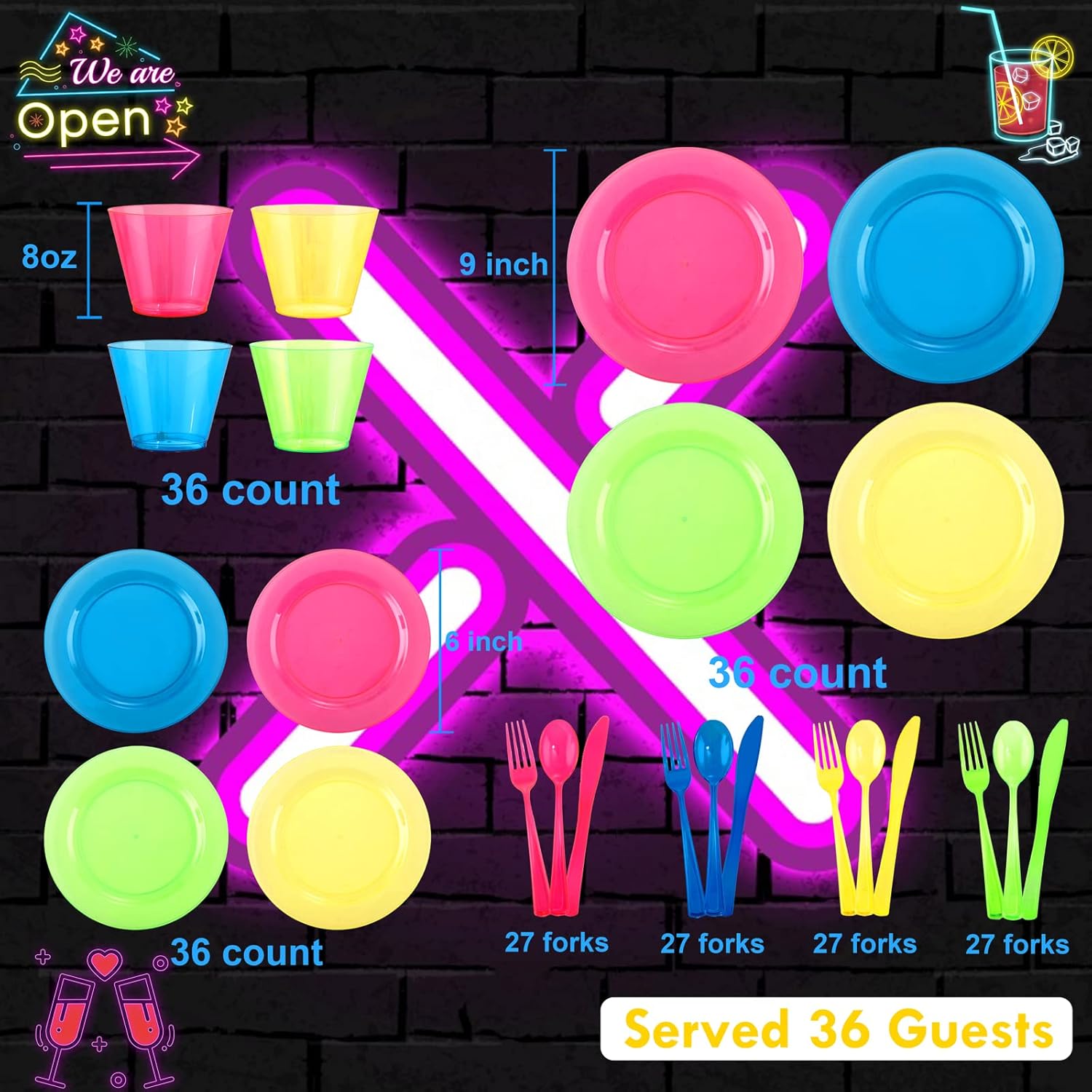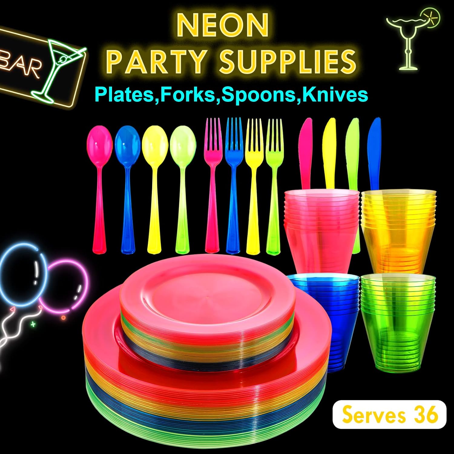 - [Premium quality]-Neon party tableware is made of 100% food grade plastics,BPA free and no-toxic. So you can use it at parties with confidence