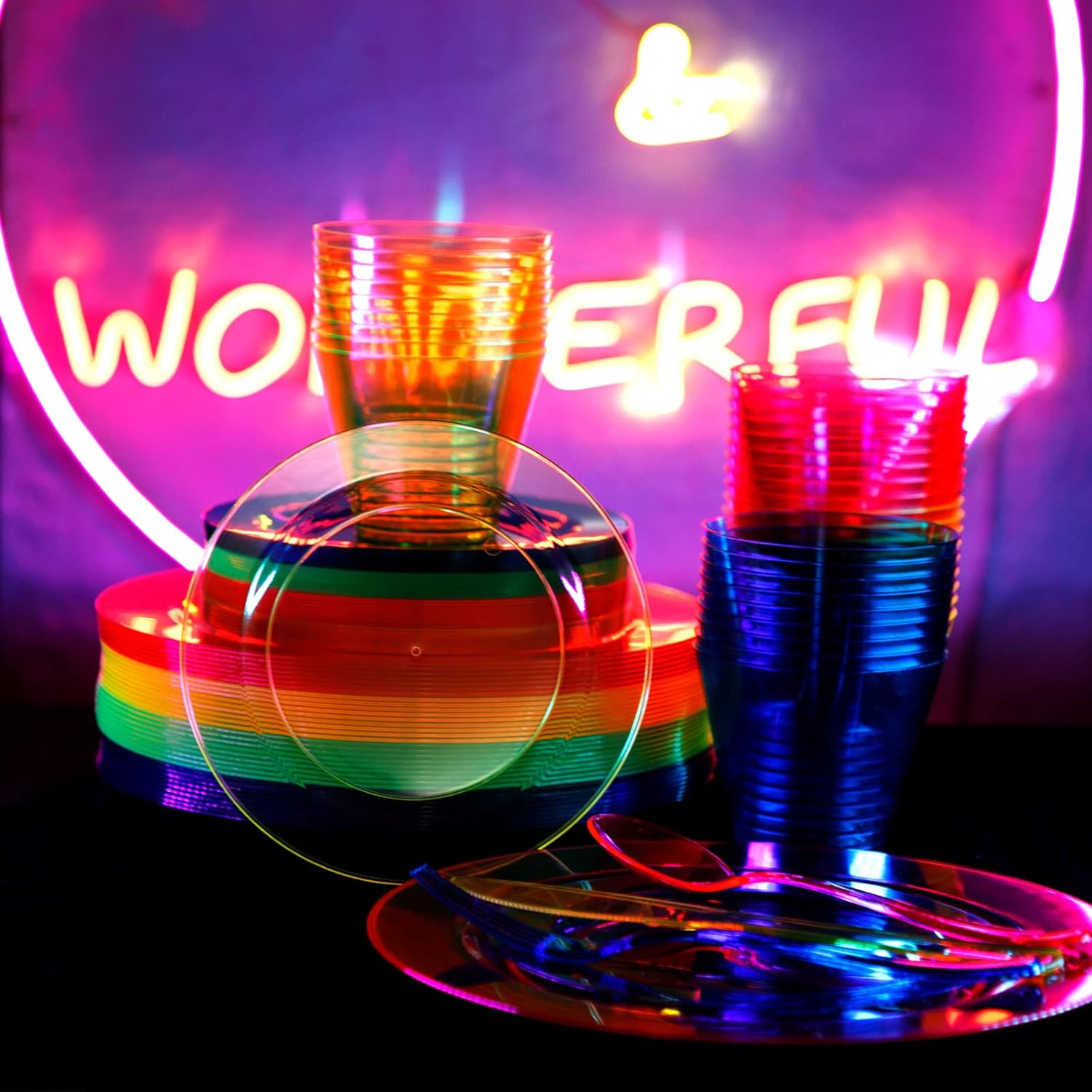 Supernal 216pcs Rainbow Plastic Plates for Party Supplies-Hard Disposable Plates Heavy Duty,Colorful Cups,Plastic Silveware in Neon Pink,Blue,Green,Yellow, Pefect for Birthdays,Party