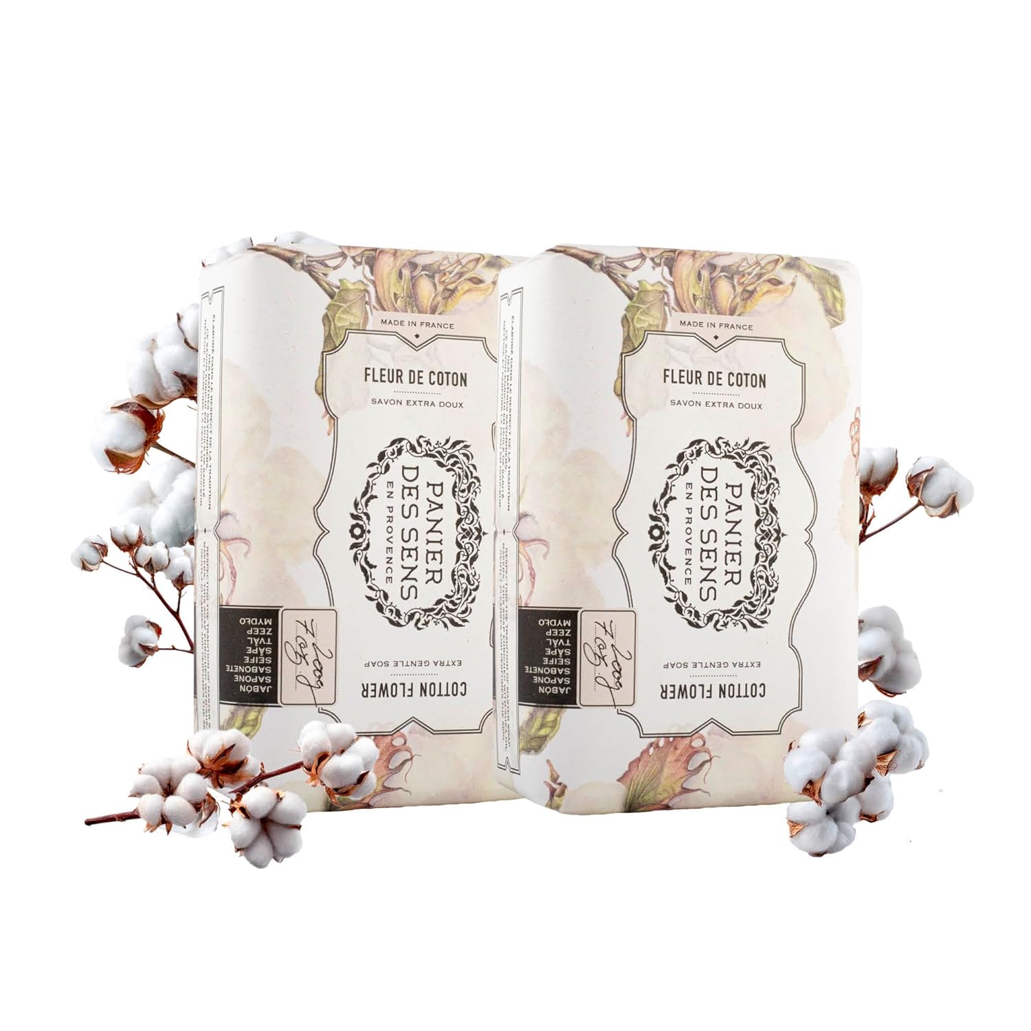 Panier des Sens Cotton Flower Shea butter natural bar soap, bath & body soap bars - Made in France 95% natural - 2 bars, 7oz/200g each