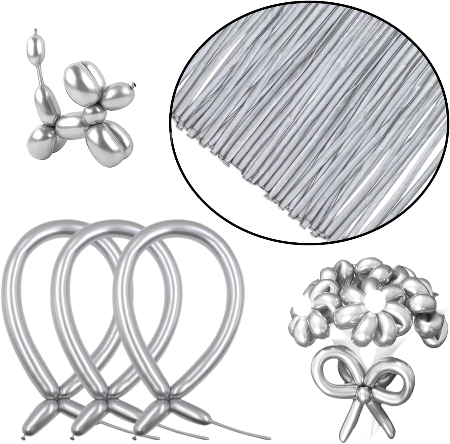 Silver Metallic 260 long Balloons 100 Pack Modeling Long Magic Balloons Shiny Latex DIY Animal Balloon for Birthday Wedding New Year Festival Party Decoration (Silver Twisting Balloons)