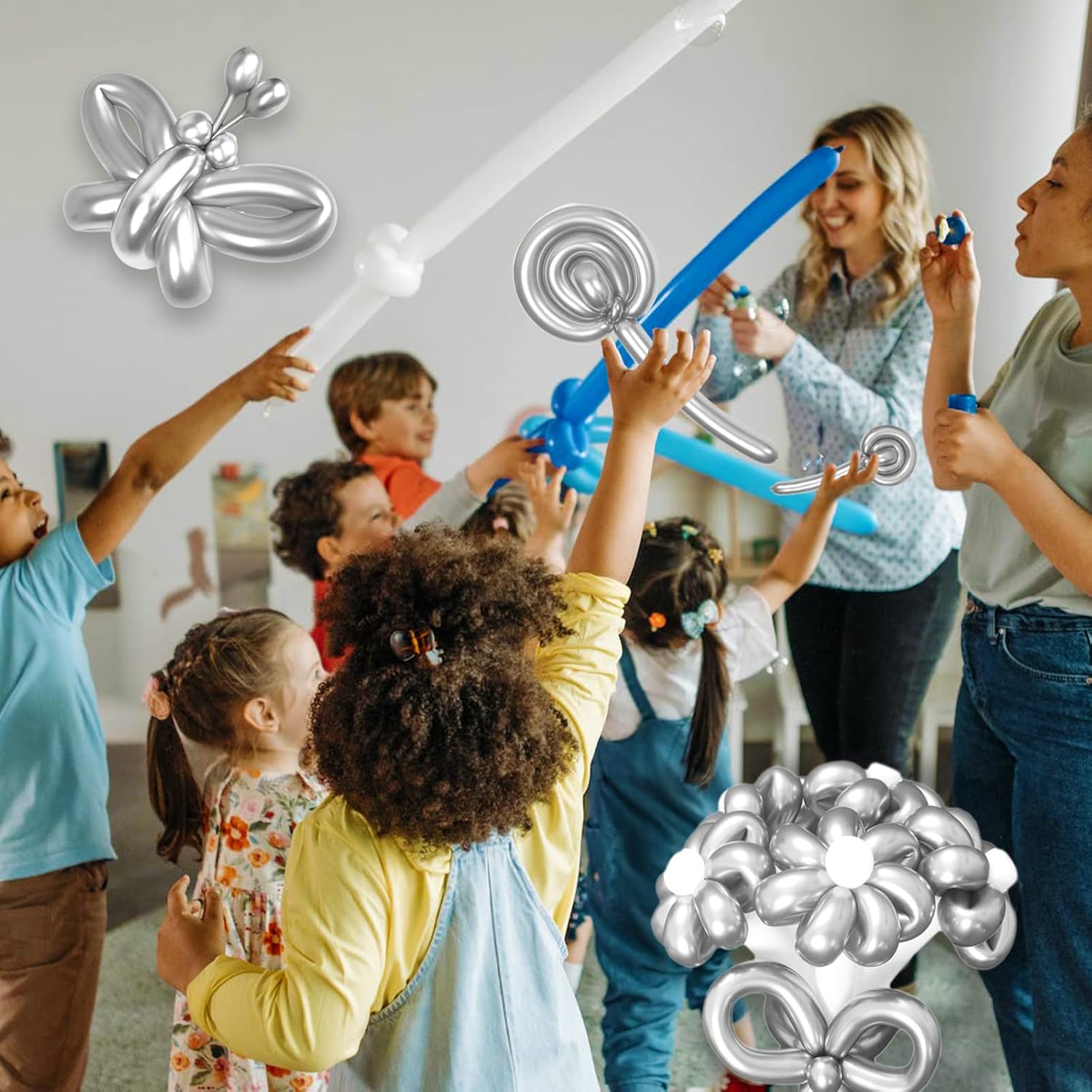 - 【ATTENTION & WARNING】It is recommended to use hand-held balloon pump to inflate at a constant speed, Pull back and forth 5-7 times with appropriate force before inflation, Make long silver balloons more flexible and convenient for DIY animal balloons, Please DO NOT overfill the twisty balloons and also avoid sunburn, overheat, pointed object and excessive friction.