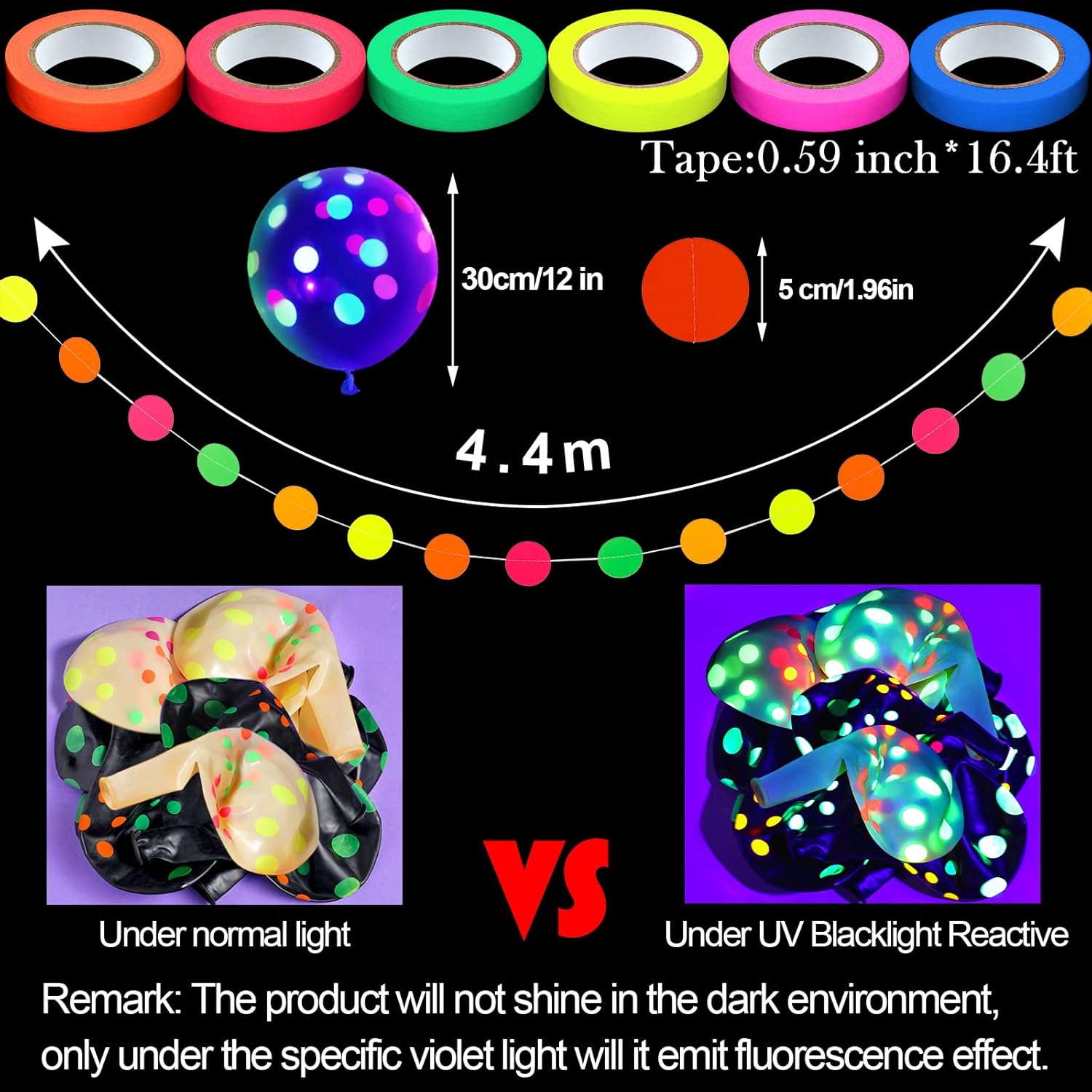 - What you can get: the glow in the dark party supplies package comes with 25 pieces of 12 inch neon latex balloons, a 173 inch neon light paper wreath, and 6 pieces of 16.4 ft ultraviolet black photosensitive tapes, which meet the needs of many festivals or daily parties decoration and are sure to be loved at any neon LED theme or luminous parties