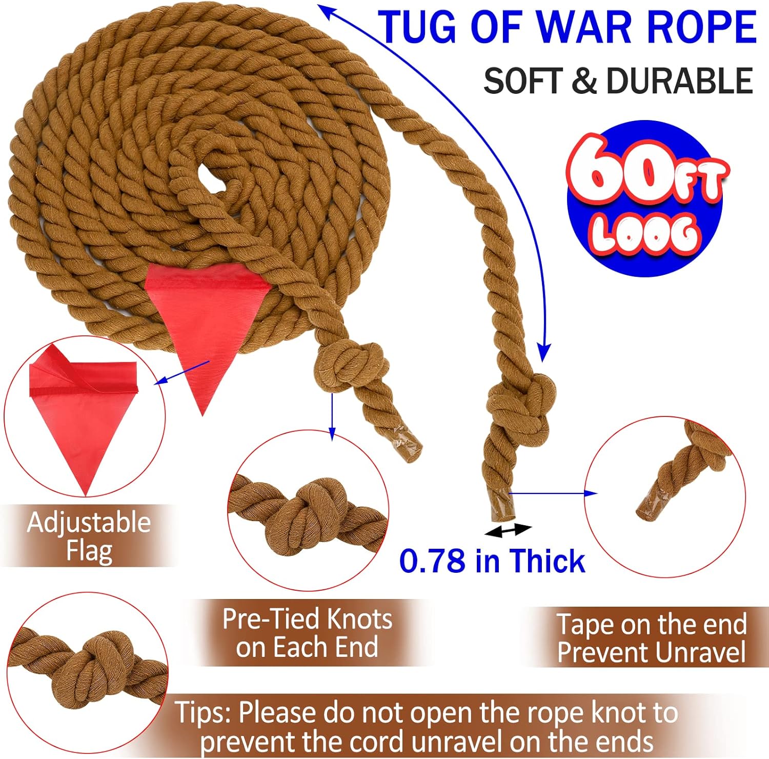 - Pre-Tied Knots to Prevent Unravel: Tug of war rope both end are pre-tied with knots and tape to help prevent unravel, So we recommend not to untie the knots and tape to prevent tug of war rope from raveled.Have a good time play with tug of war games and pulling your team to victory and win an award medal.