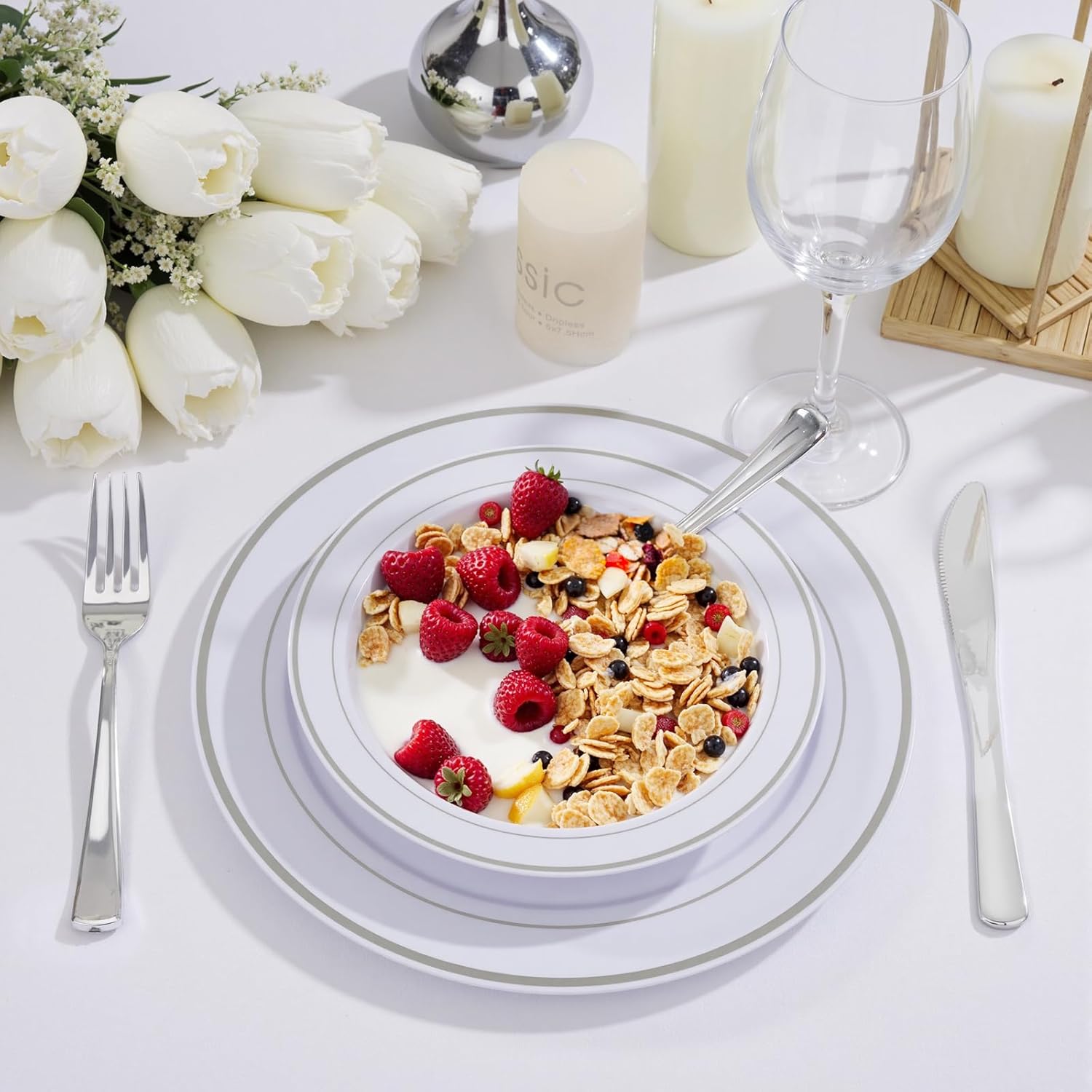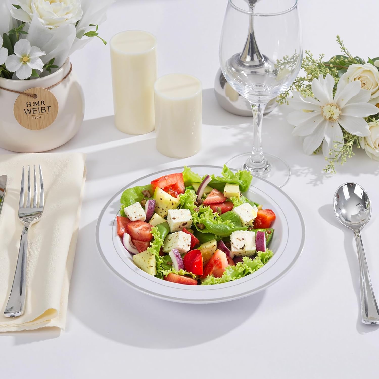 - Versatile for Any Theme or Setup: From buffet lines to outdoor receptions, these disposable plastic bowls blend seamlessly with any decor. The neutral white-and-silver palette pairs effortlessly with tableware, making them a chic, practical choice for hosts.