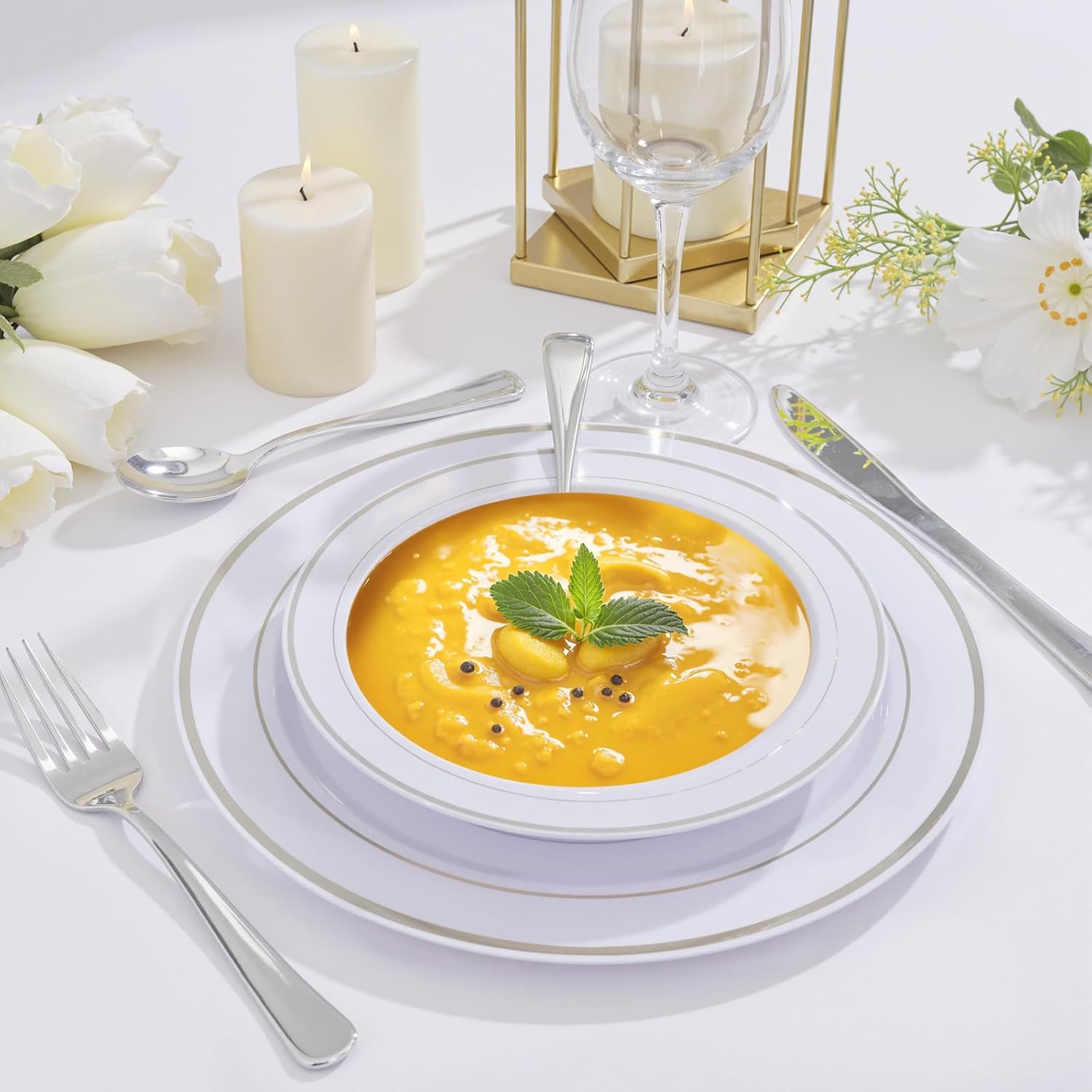 - Sophisticated Design for Weddings & Celebrations: Elevate your event tablescape with these plastic soup bowls disposable featuring a timeless white finish and shimmering silver foil accents. The sleek round shape adds modern elegance to weddings, receptions, Christmas or upscale parties.