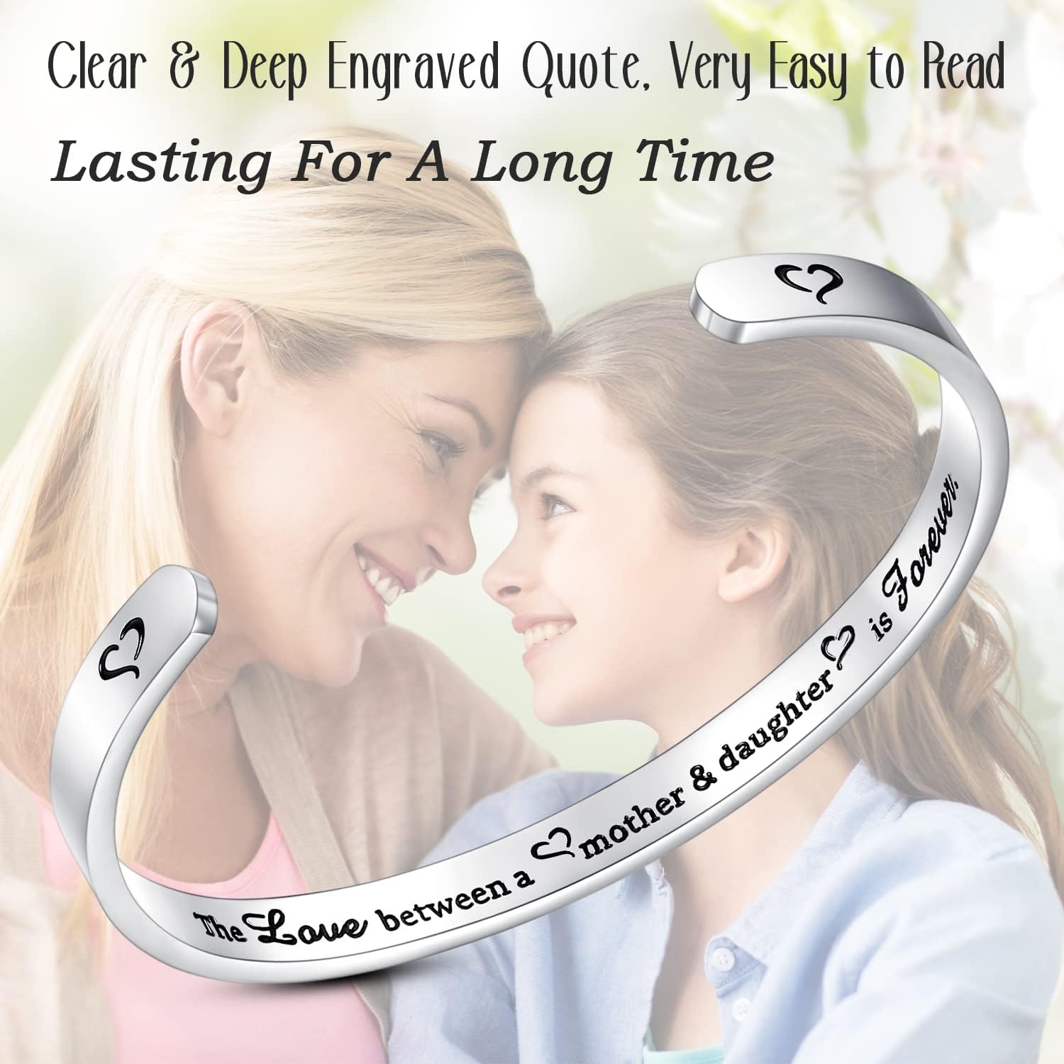 - Gifts for Daughters from Mother : This cuff bracelet engraved with "The love between a mother and daughter is forever." message inside. Make her smile with this concise and kind mother-daughter quote bracelet.