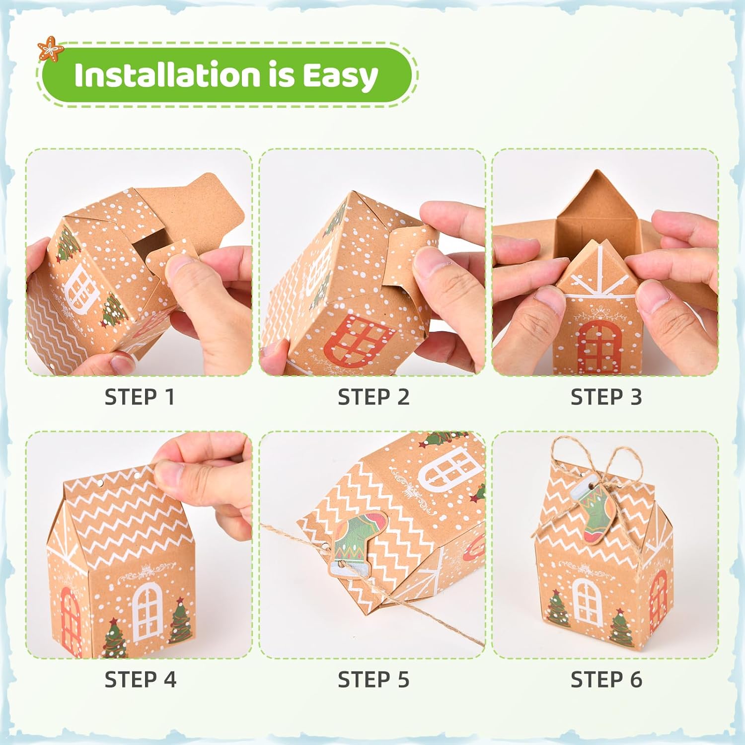 - .Easy to operate: Our kraft paper boxes are designed in the shape of a tiny house with pre-creased lines, just fill with your candies, cocoa biscuits or other gifts and follow the lines Fold the box, tie twine, and put your favorite patterned label tied to the box