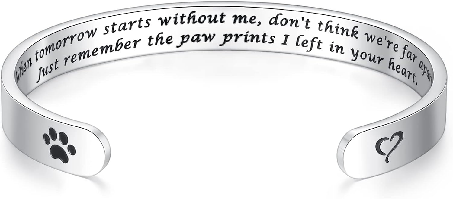 - Dog Memorial Gifts : This cuff bracelet engraved with "When tomorrow starts without me. Don't think we're far apart. Just remember the paw prints I left in your heart."