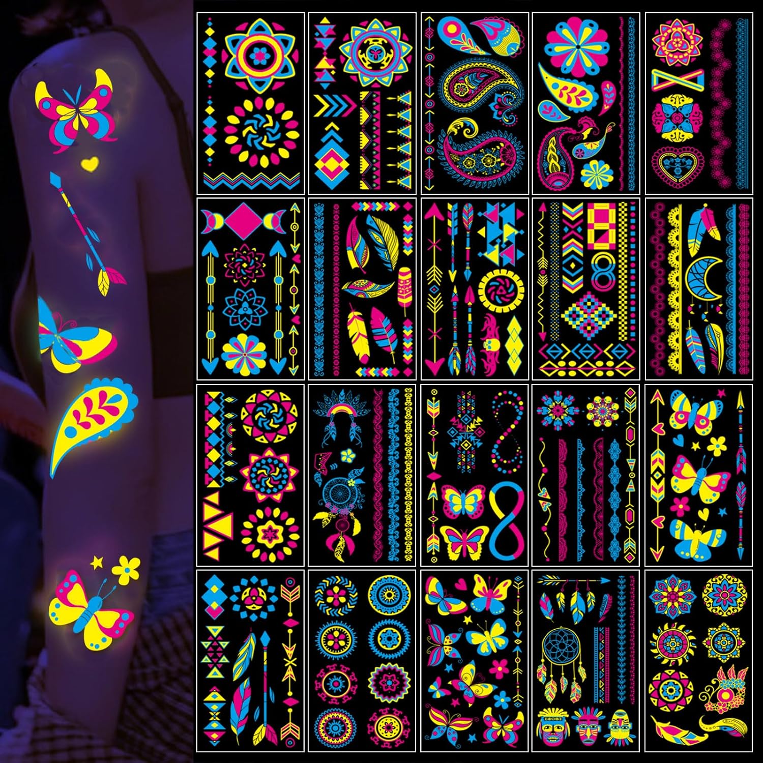 - Easy to Apply: UV glow neon tattoos are clear and colorful, can be used alone, and easy to stick to the skin, such as the face, arms, chest, abdomen, waist, hips, neck, shoulders, ankles and anywhere.