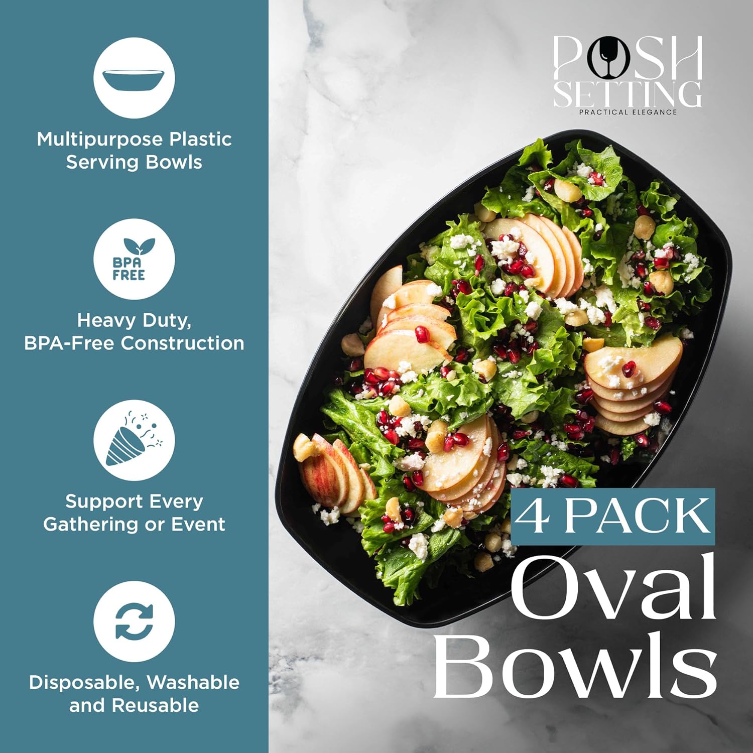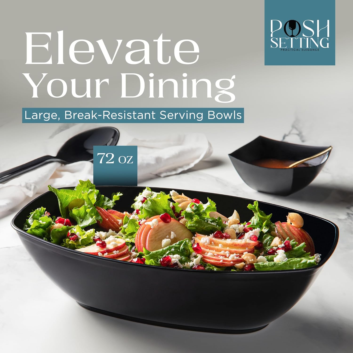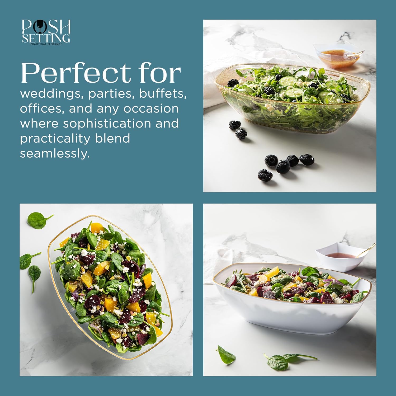 - MULTIPLE COLORS AND SIZE OPTIONS – We offer Posh Setting disposable plastic serving bowls in 8 great colors: Black, White, Clear, Gold Glitter, and Silver Glitter. Suitable for use as black serving bowl, party bowls for serving food, black plastic bowls, plastic party bowls, and large serving bowl.