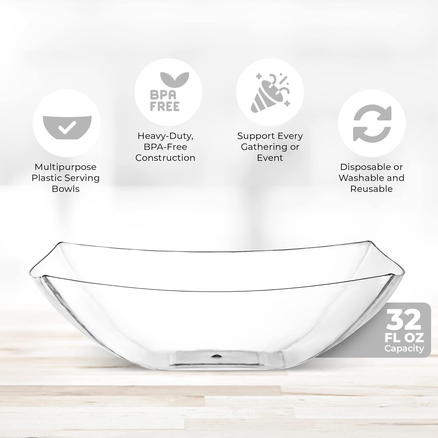 Posh Setting - Clear Plastic Serving Bowls for Party (32oz - 4 Pack) Square, Disposable, Salad & Fruit Bowls for Party Table, Candy Containers for Candy Buffet