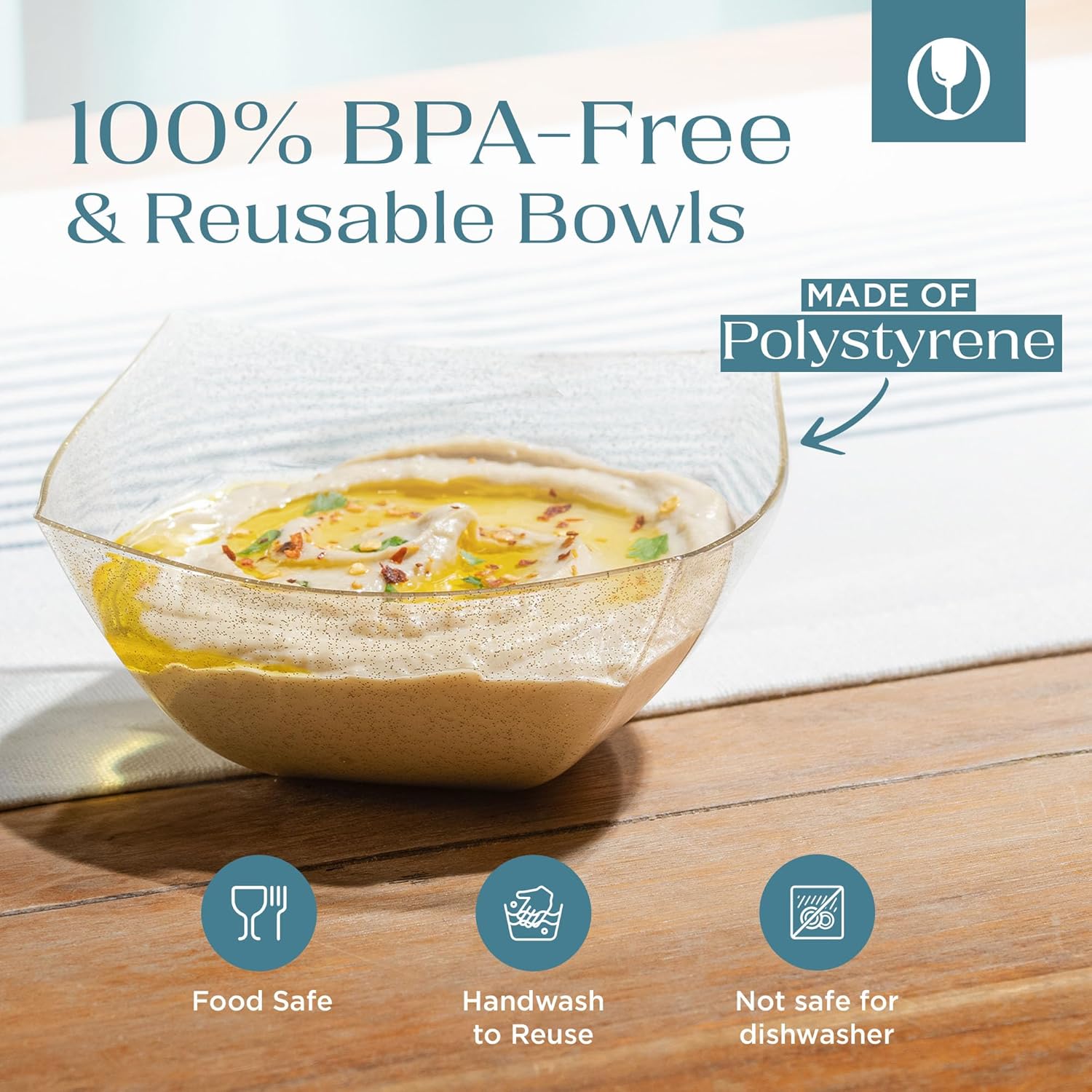 Posh Setting Gold Glitter Plastic Serving Bowls (8oz - 4 Pack) Square Disposable Containers for Party Table, Chips, Candy Buffet, and Salad