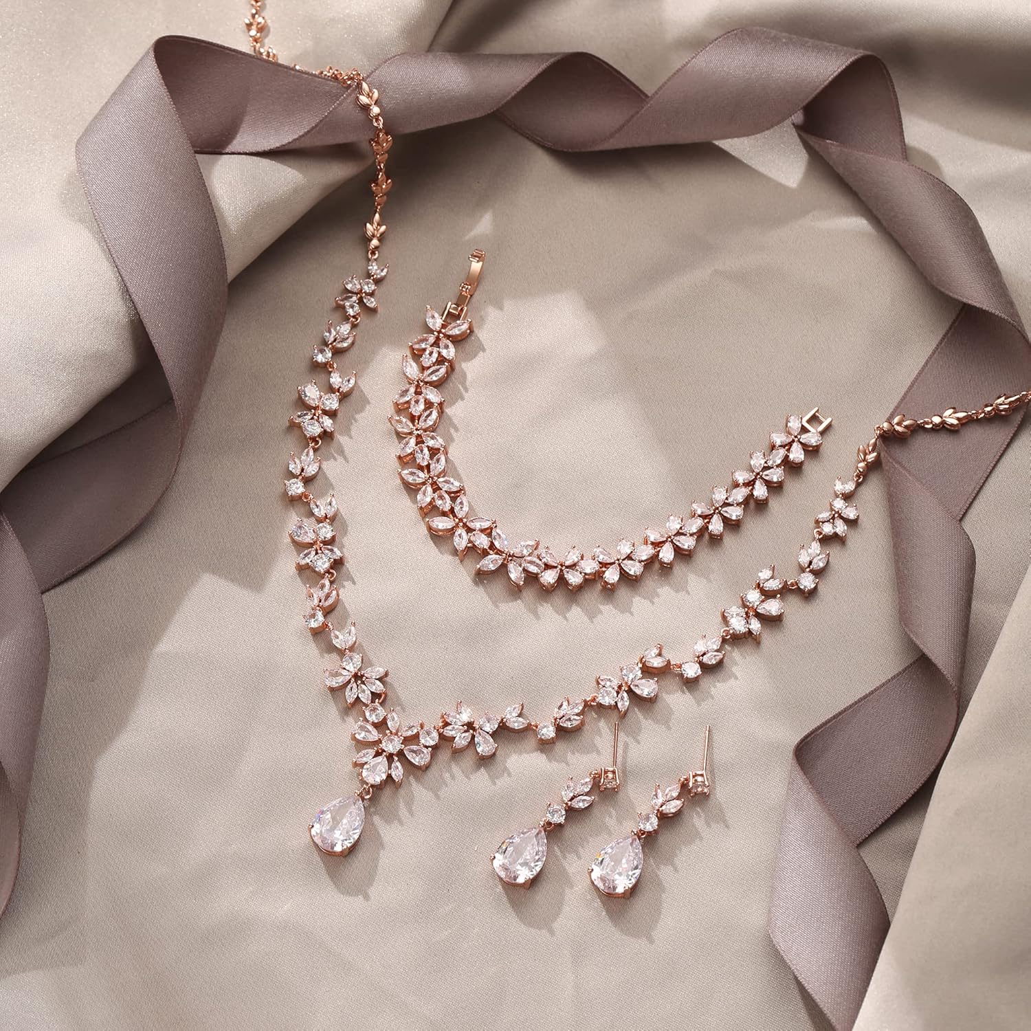 EVER FAITH Bridal Jewelry Set for Bride Bridesmaid, Flower Leaf Teardrop Cubic Zirconia Necklace Dangle Earrings Bracelet Sets Wedding Party for Women