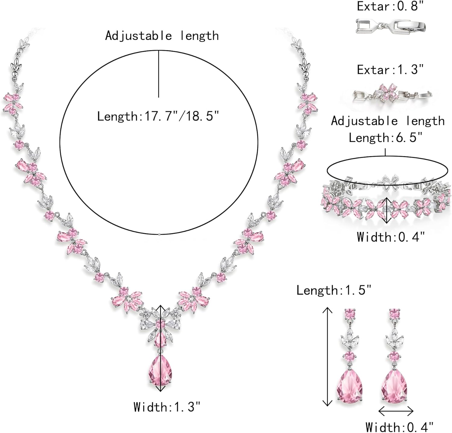 - Wedding Necklace Chain Length: 45cm(17.7")-47cm(18.5"), Attachment Size: 25cm(9.8")by3.5cm(1.3"), Bracelet Length: 16.5cm(6.5")-20cm(7.8"), Bracelet Width: 1.1cm(0.4"), Earrings Size: 3.8cm(1.5") by 1cm(0.4"), For Pierced Ears Only.