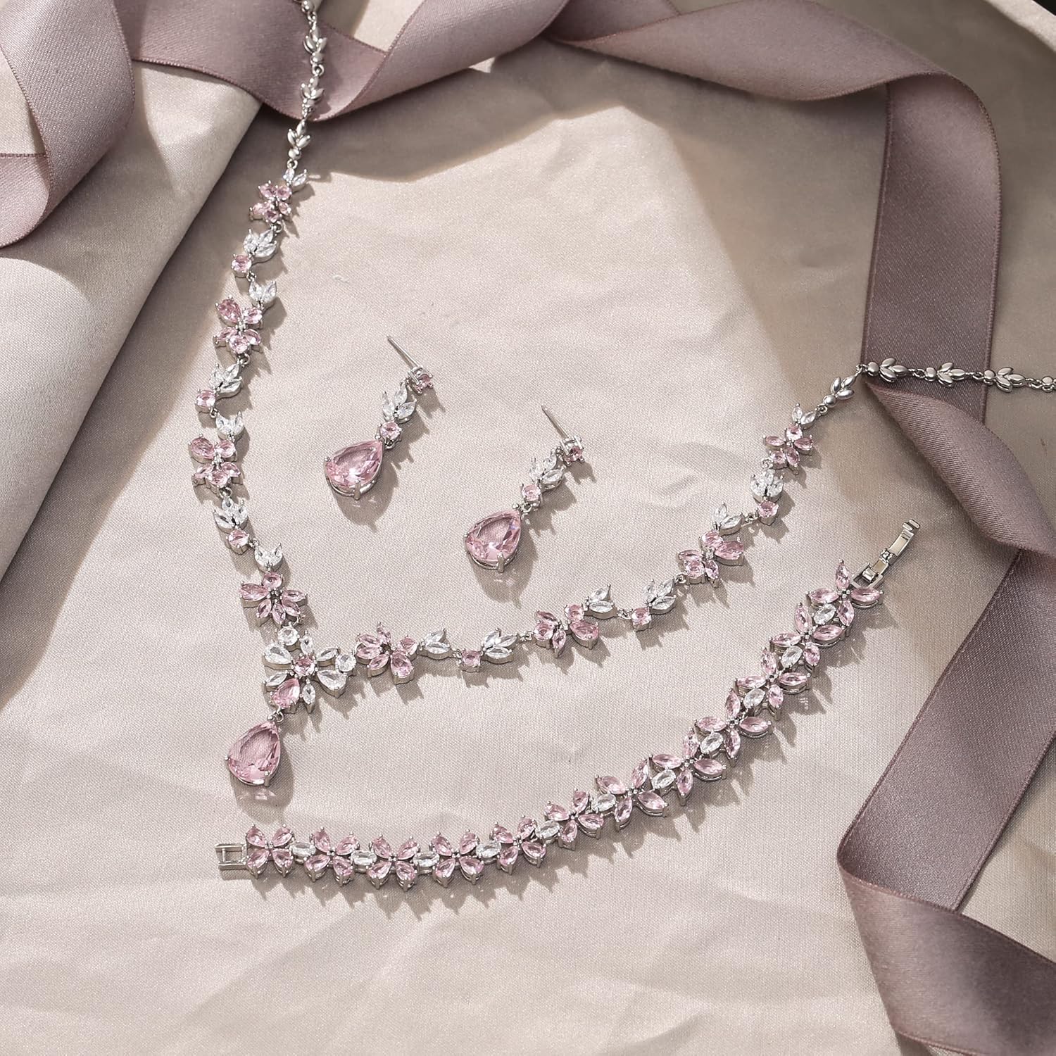 - If you are going out to a party or banquet, this birthstone bridal wedding dangle earrings necklace bracelet set is the perfect accessory that will enhance your outfit. With a fabulous water drop and flower CZ design and solid construction. It features sparkly CZs which will make a timeless accessory to any jewelry collection. This wedding jewelry set can be worn with classy casual or formal attire.