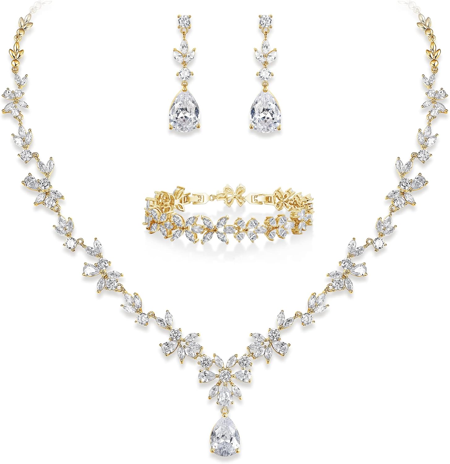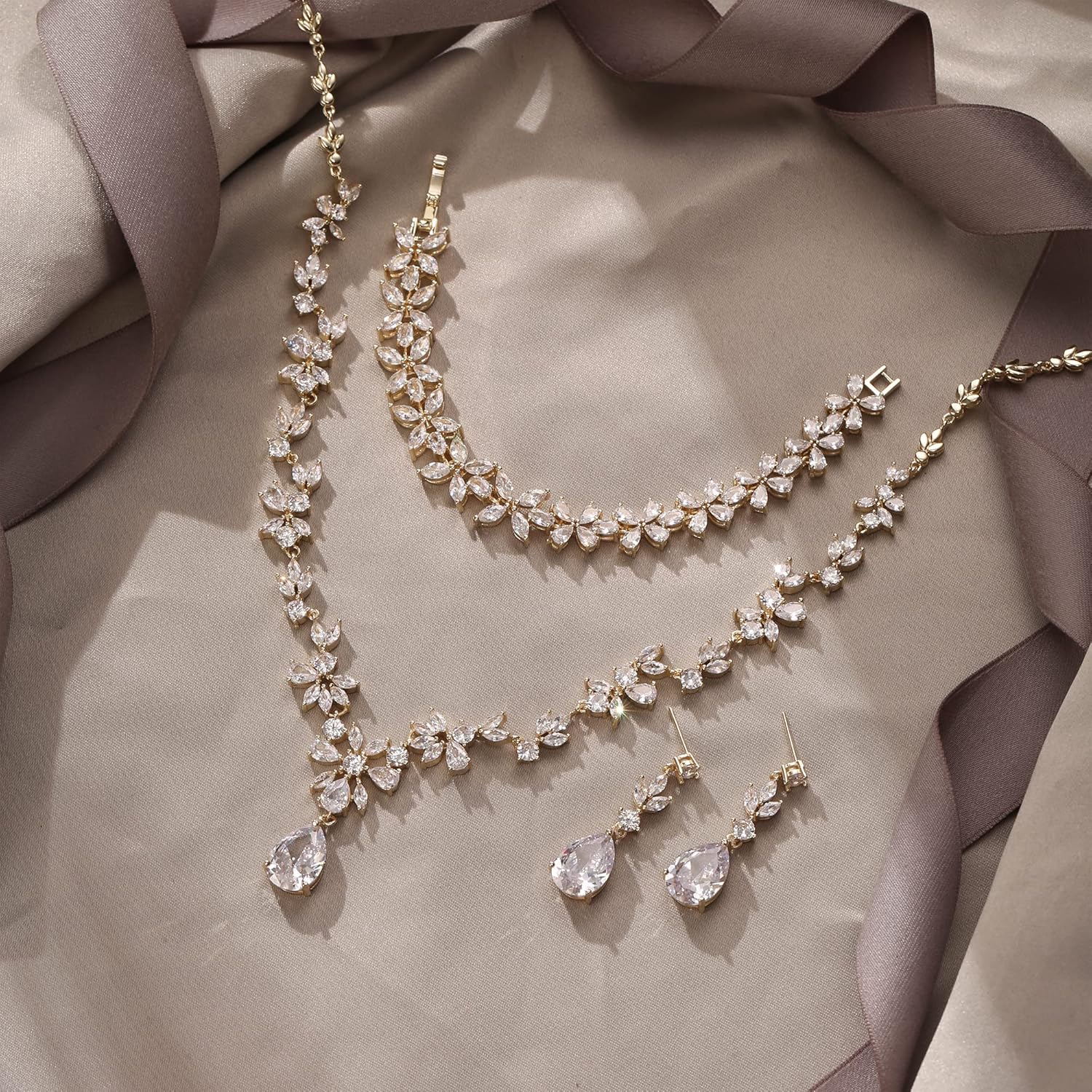 - If you are going out to a party or banquet, this birthstone bridal wedding dangle earrings necklace bracelet set is the perfect accessory that will enhance your outfit. With a fabulous water drop and flower CZ design and solid construction. It features sparkly CZs which will make a timeless accessory to any jewelry collection. This wedding jewelry set can be worn with classy casual or formal attire.