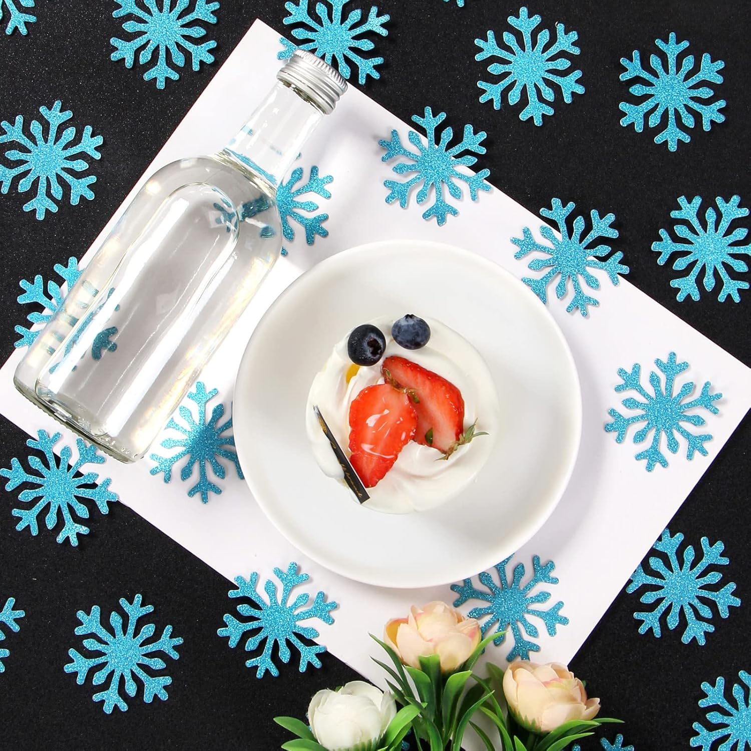 - The party confetti includes 100pcs paper snowflake confettis. The size of the snowflake paper dots is 2.12” which is more thick and bigger than plastic confetti. So it’s much easier to clean up.