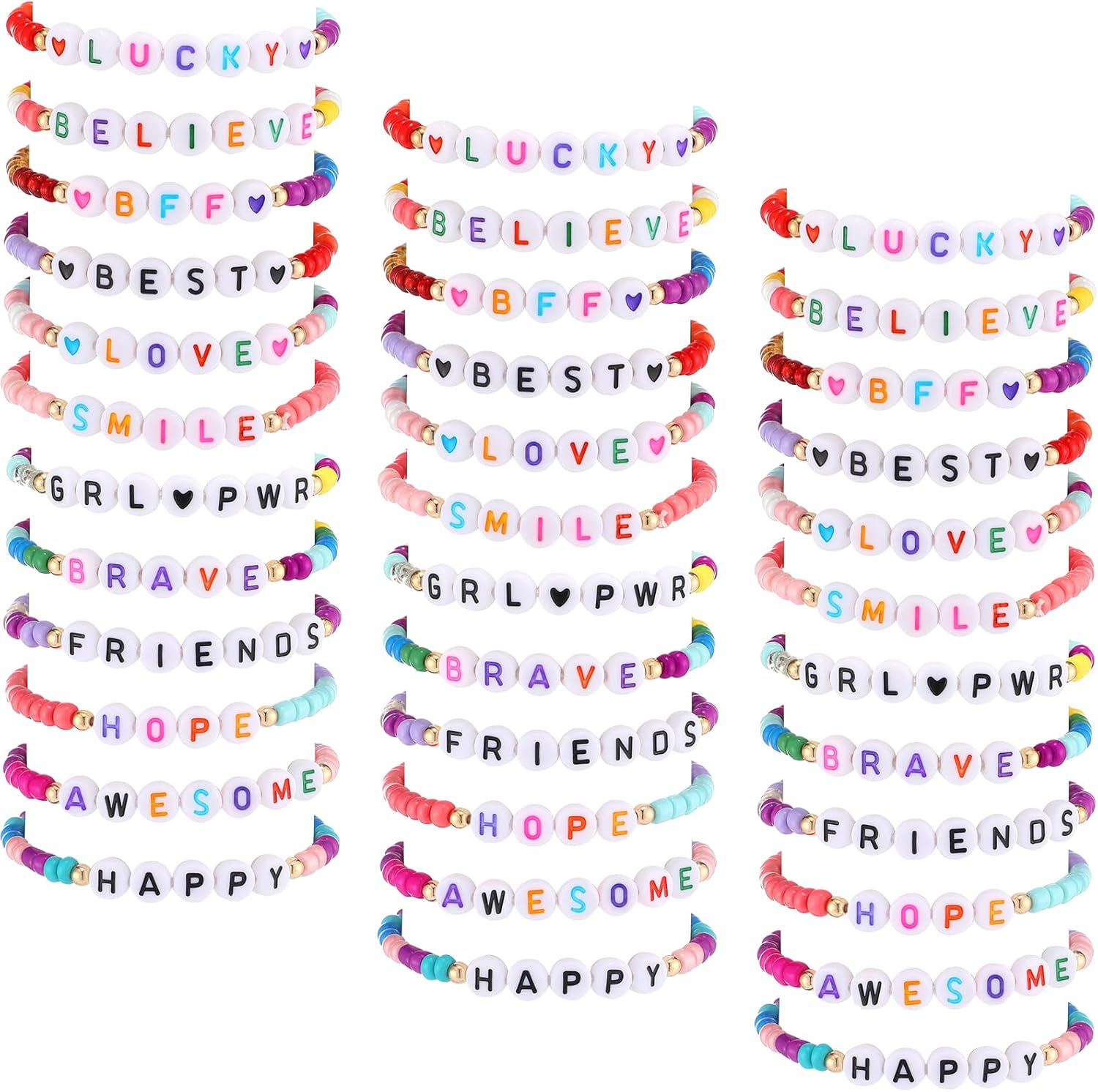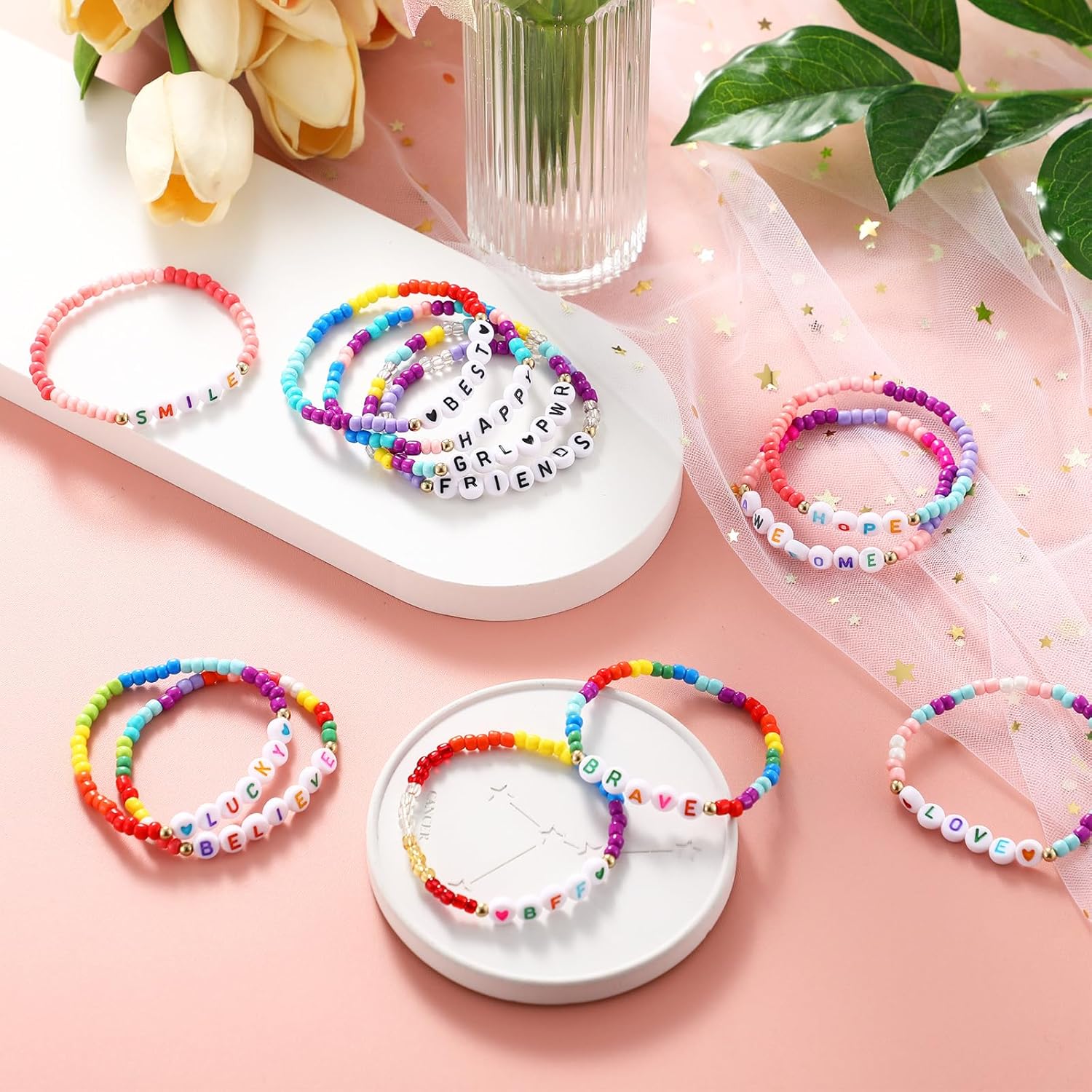 - Cute Designs: there are 12 kinds of letters designs among friendship bracelets for girls, such as [smile], [lucky], [believe], [hope], [happy], [friends], [brave], [believe], [best], [awesome], [love] and more, meaningful words and colorful beads making them eye catching for you and your kids