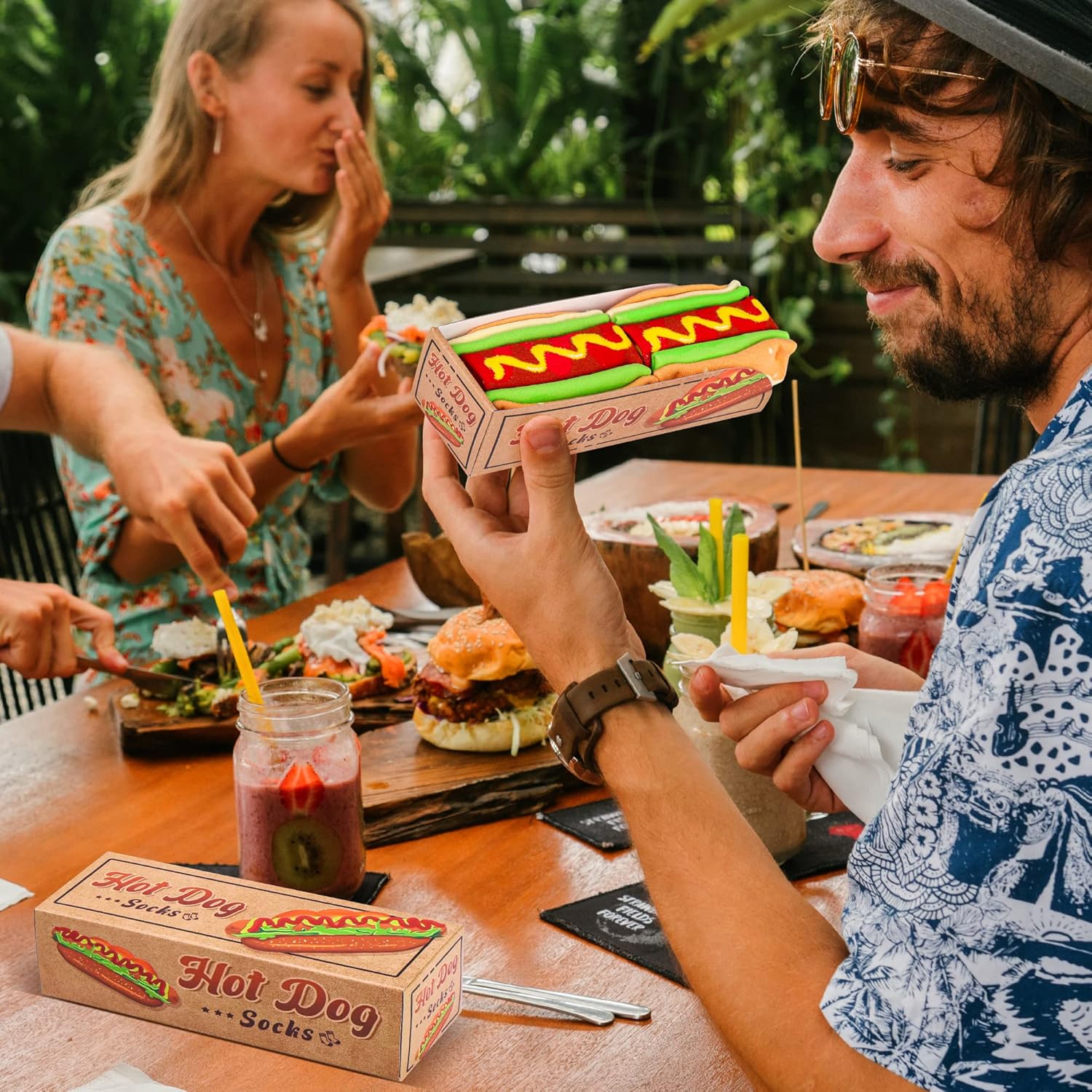 - Funny Hot Dog Socks:Are you a big fan of hot dog? Open the hot dog box, who would have thought that there were socks inside? The whole product is wrapped in paper and an colourful original box,like the hot dog straight out of a restaurant. Surprise effect guaranteed! It is a great gift for anyone who likes hot dog or creative items!Everyone will get a huge kick out of these hot dog socks box and they'll be quite the conversation piece.