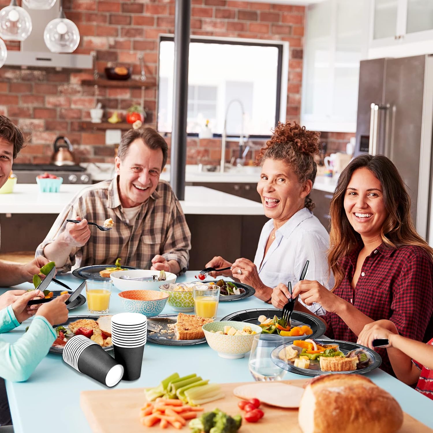 - Enjoy More Party Time: Nobody likes to clean up after a party, which is why we designed this disposable paper plate,cups and tableware set! You can throw it away when you clean up after party. Save time, let's spend more time with our family or friends