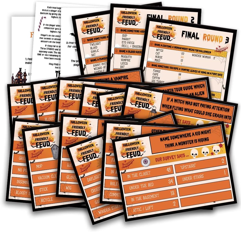 - This is a Halloween theme of the classic friendly feud game! Includes 3 Game Instruction Cards - 12 Question Moderator Cards and 3 Quick Final Rounds Game Cards.