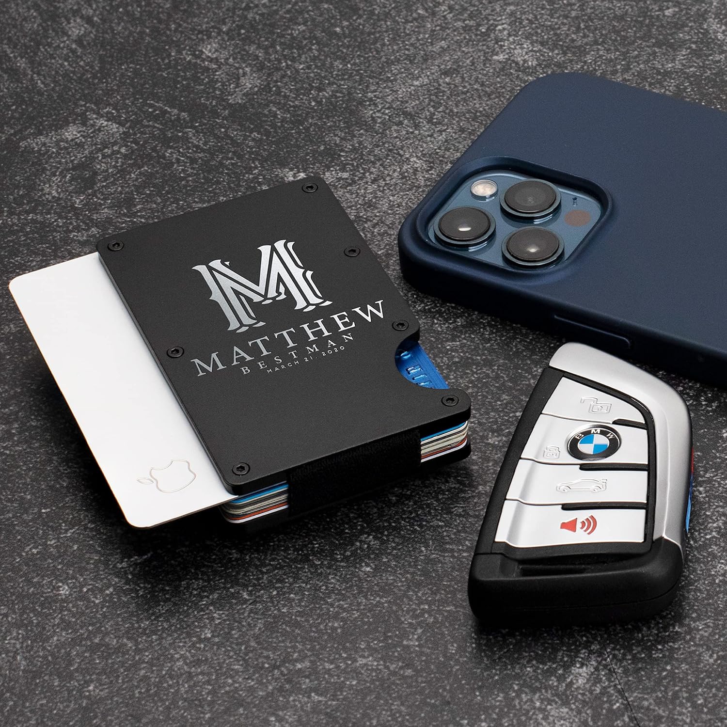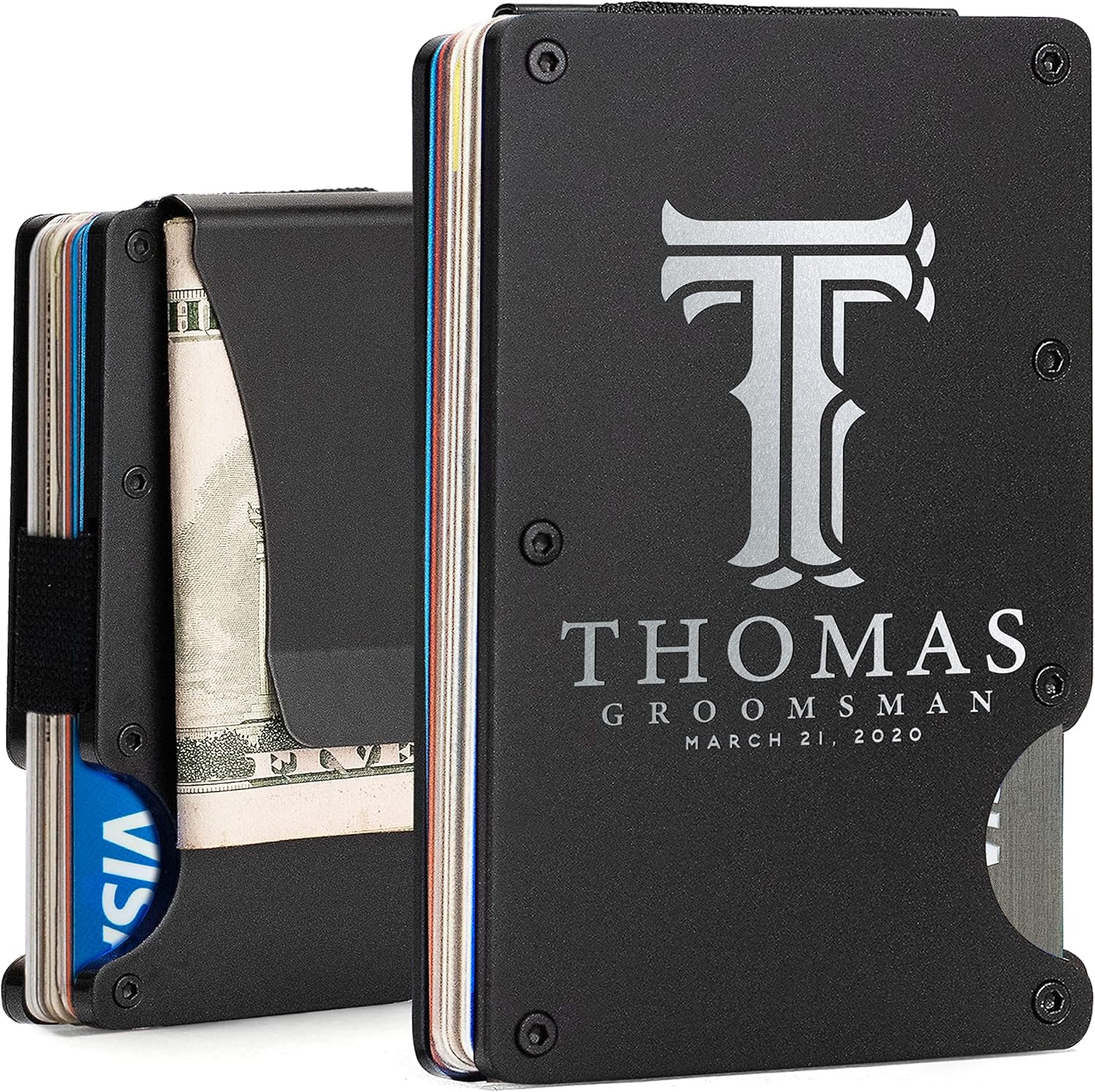 - UNIQUE GROOMSMEN GIFT FOR MEN: We present you with our elegantly personalized metal card holder wallet, a great gift idea for a groomsman proposal, customized with an initial, a name, a title, and a date of your choice. Best wedding gift for a groom, groomsmen, best man, father of the bride, or your wedding usher.